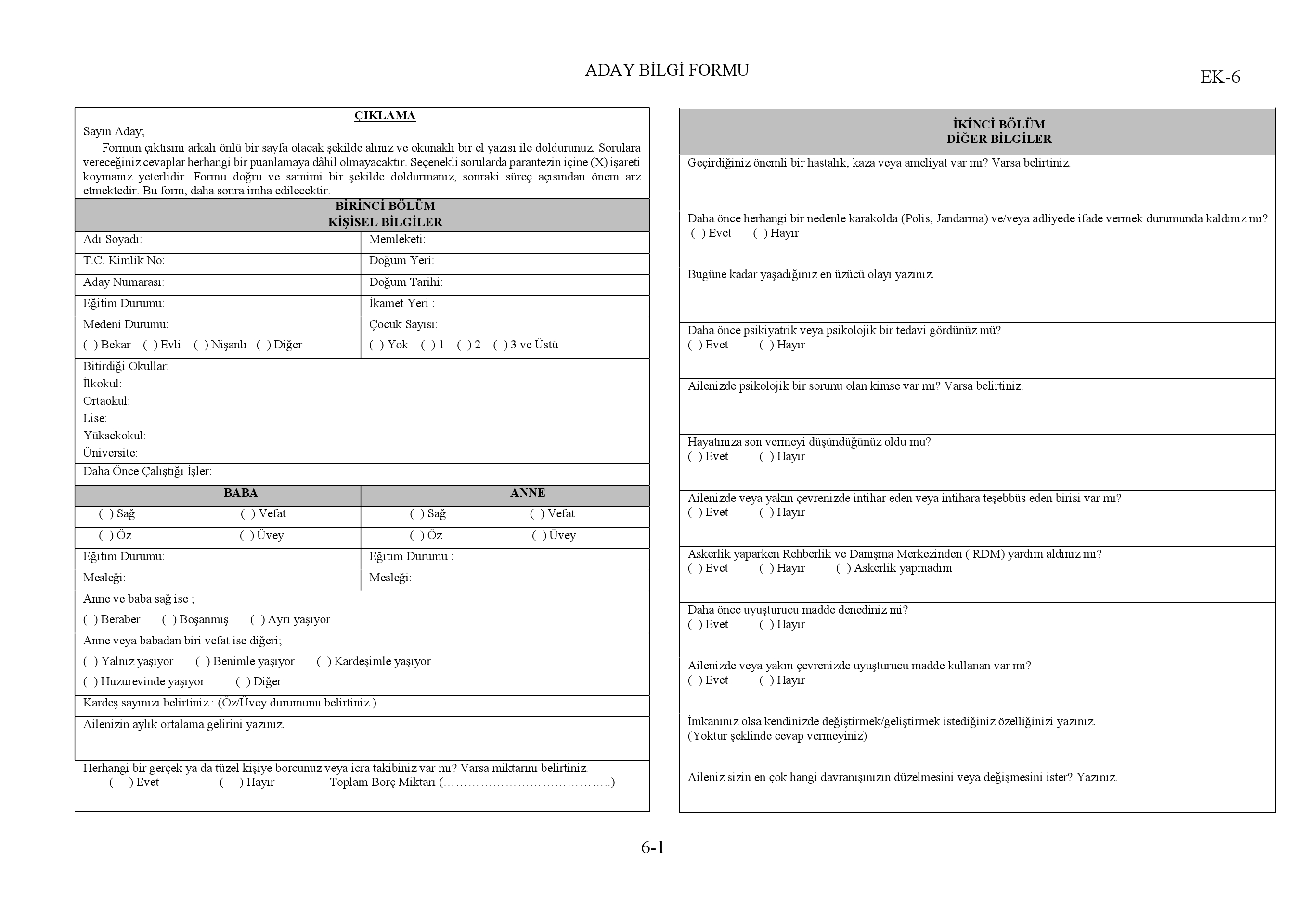 (h) Aday tarafından doldurularak beraberinde getirilecek olan Aday Bilgi Formu (Örneği Ek-6'tadır),
