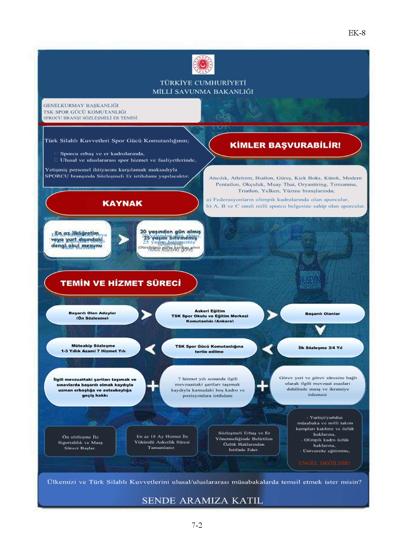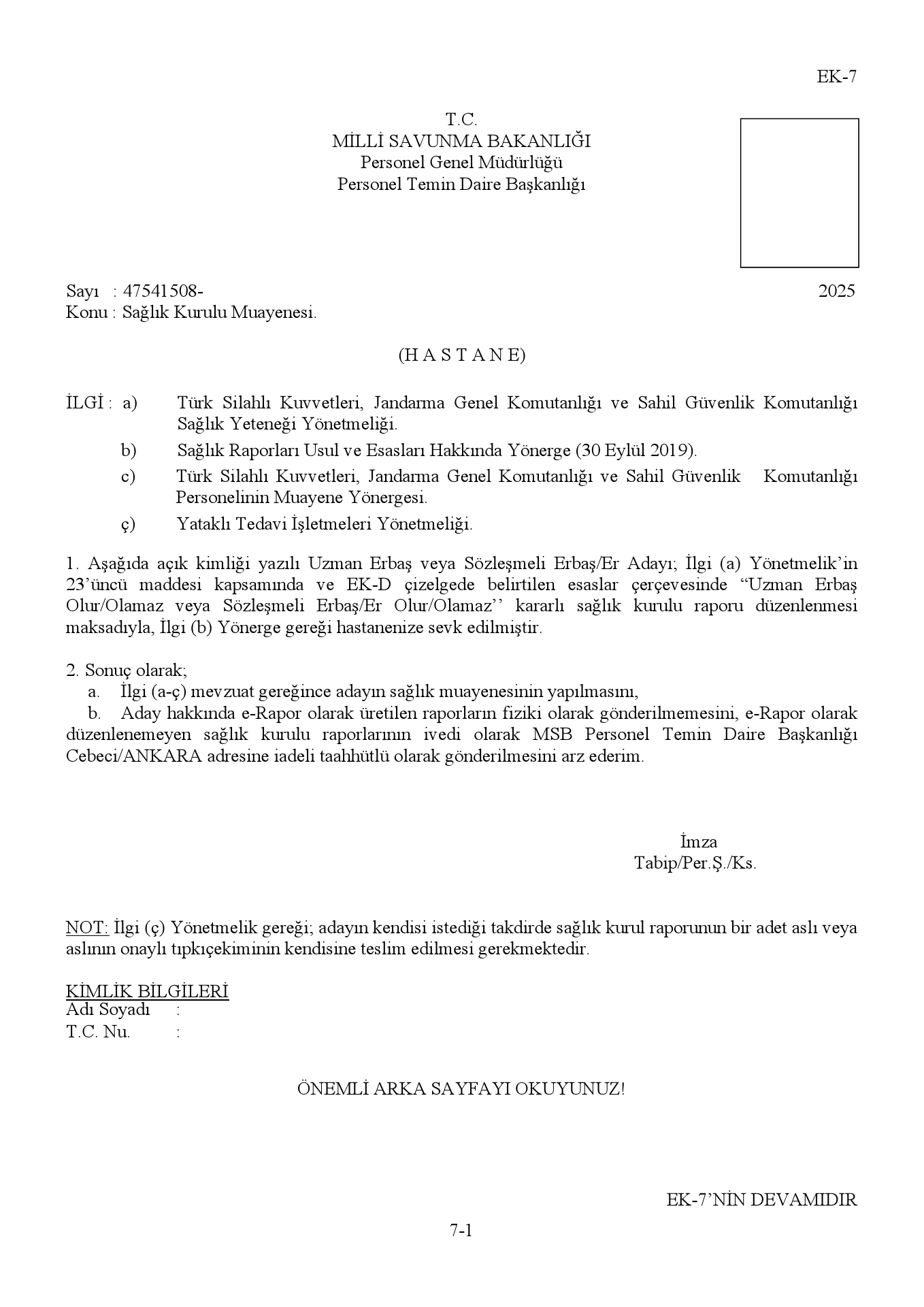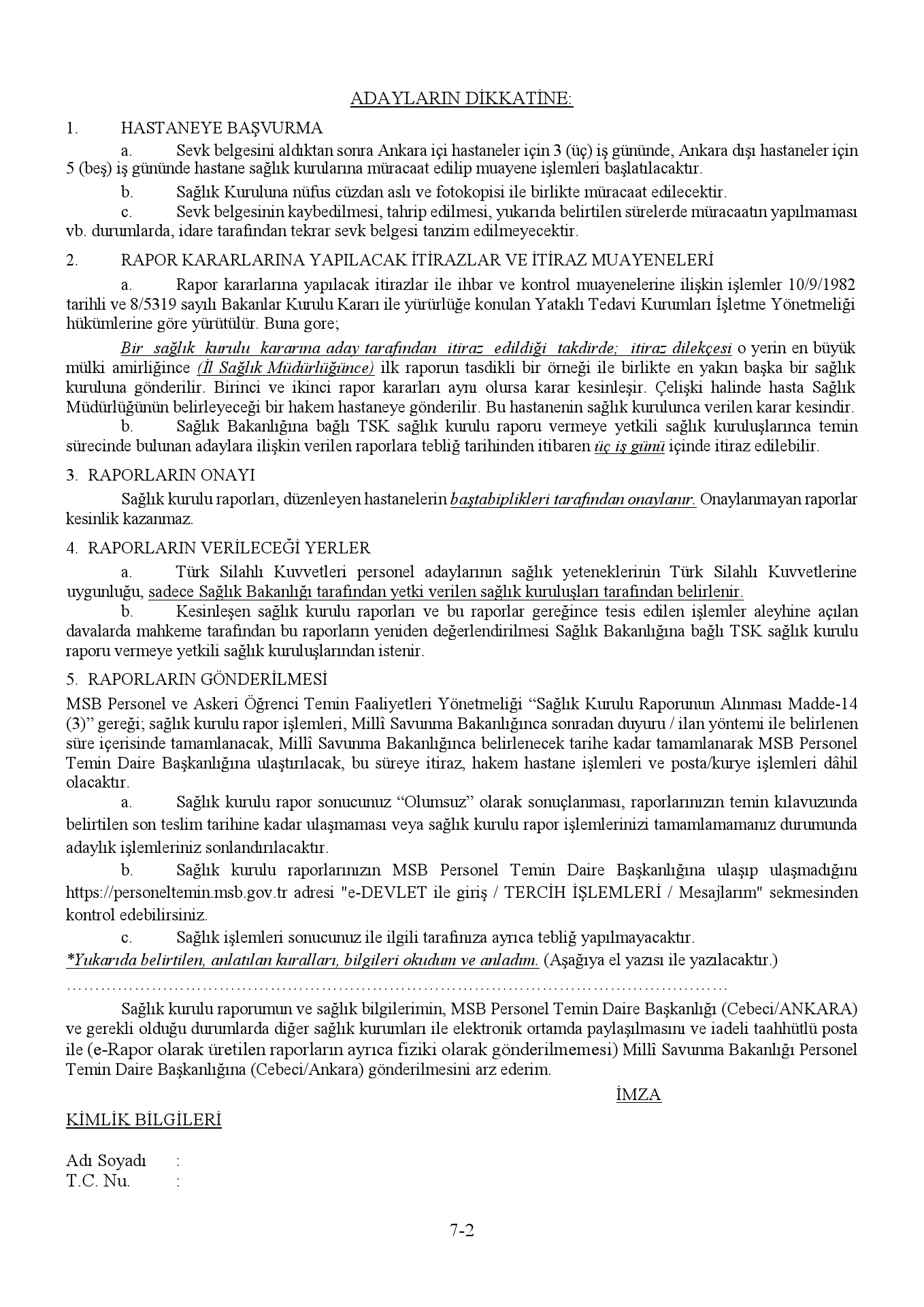 (1) MSB Personel Temin Daire Başkanlığı (Cebeci/ANKARA) yerleşkesinde veya daha sonradan duyuru yapılacak sınav merkezinde yapılacak Sözleşmeli Er Temin Faaliyeti kapsamında icra edilecek seçim aşamalarında başarılı olmanız halinde işlemlerinizin sürdürülebilmesi için Hastane Sevk Belgesi (Ek-7) ile sevk edileceğiniz Türk Silahlı Kuvvetleri, Jandarma Genel Komutanlığı ve Sahil Güvenlik Komutanlığı sağlık kurulu raporu vermeye yetkili sağlık kuruluşlarından "Sözleşmeli Er Olur" kararlı sağlık raporu almanız gerekmektedir. İstenen raporu alamayan adaylar seçim aşamalarından elenmiş sayılacaklardır.