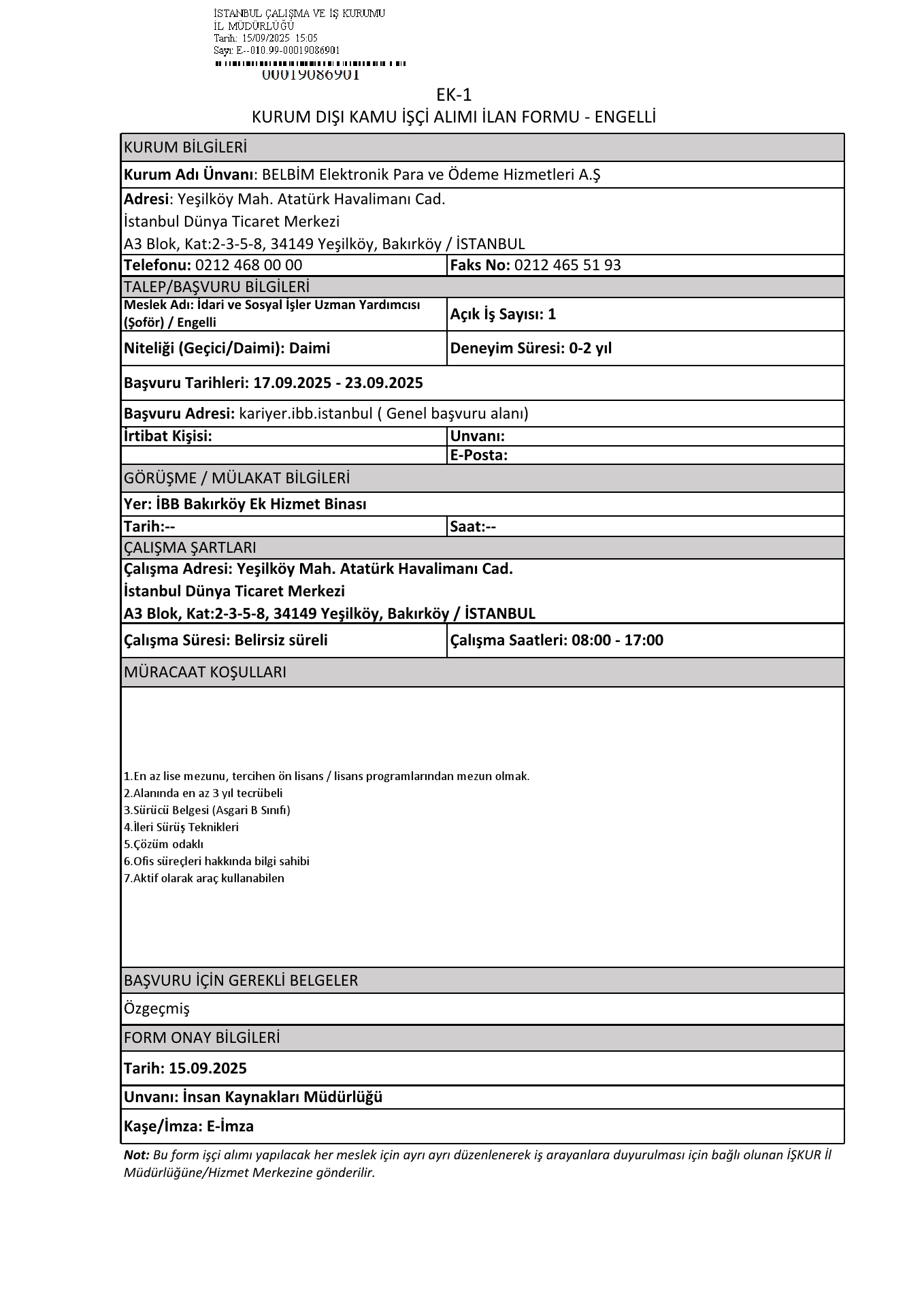 İstanbul Belbim 1 İşçi Alacak. Son başvuru tarihi 23 Eylül 2025