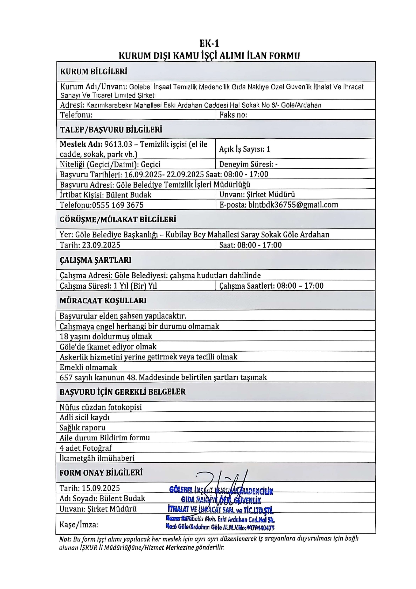 Ardahan Gölebel İnşaat Geçici 1 İşçi Alacak. Son başvuru tarihi 22 Eylül 2025
