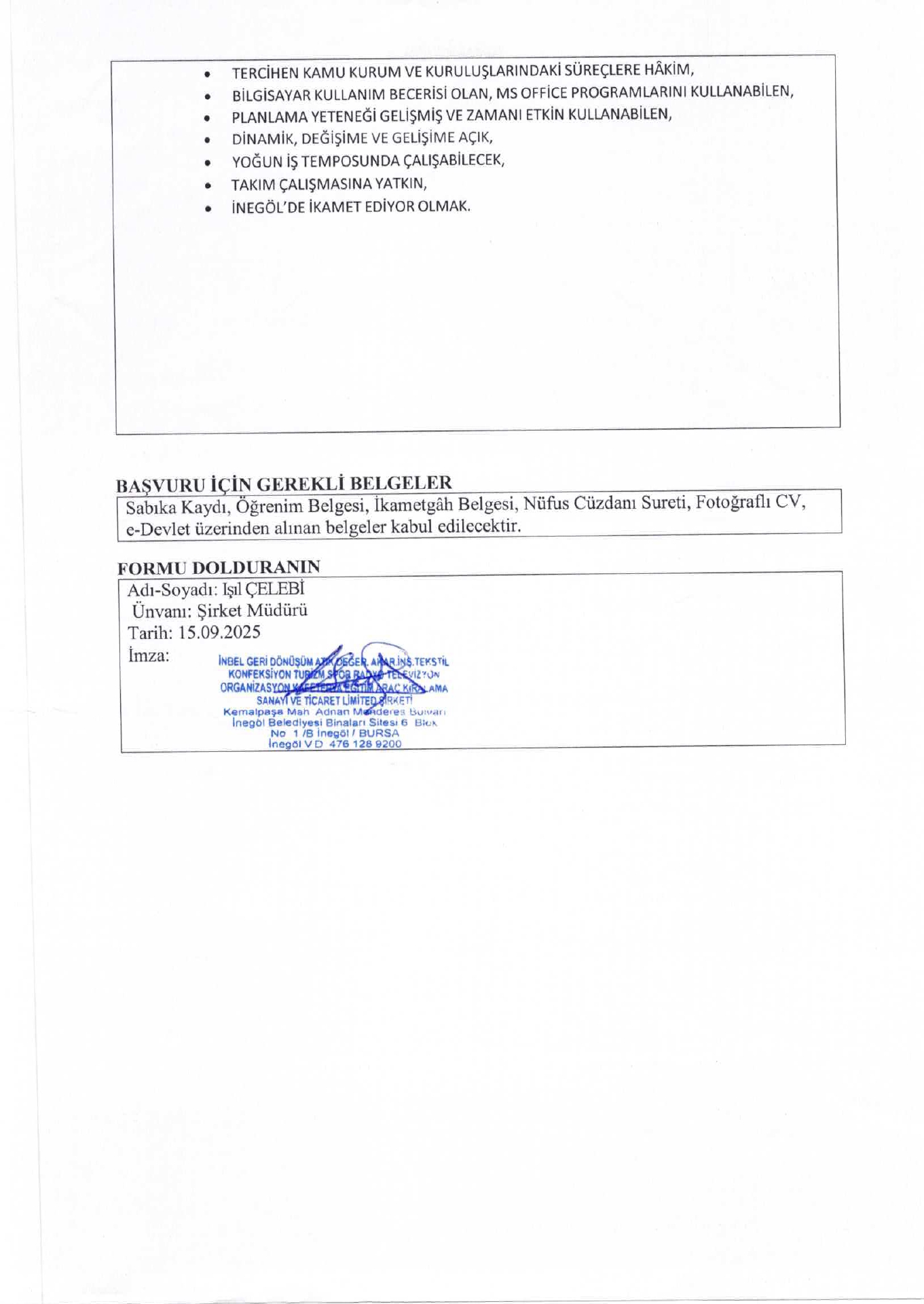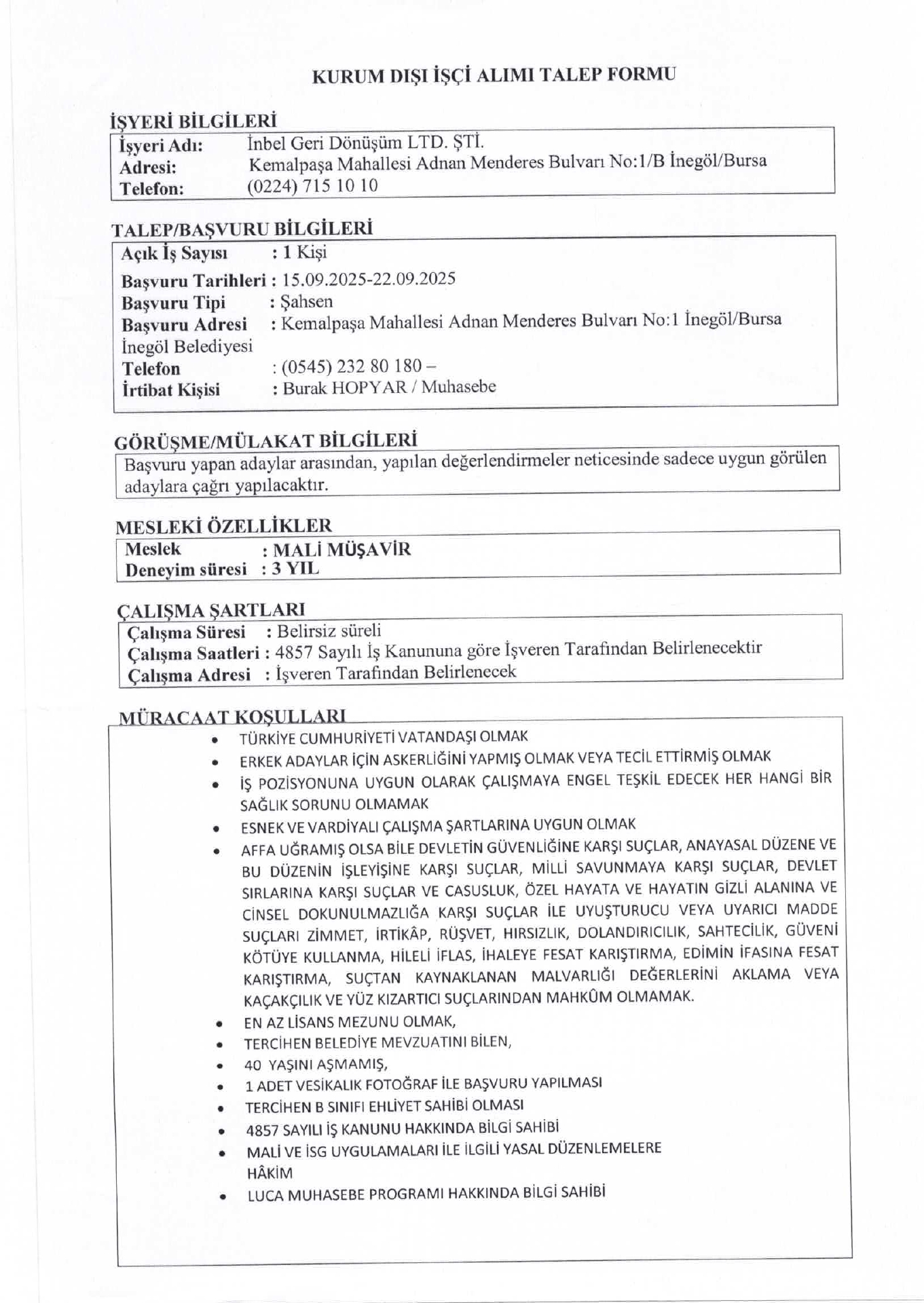Bursa İnbel 1 İşçi Alacak. Son başvuru tarihi 22 Eylül 2025