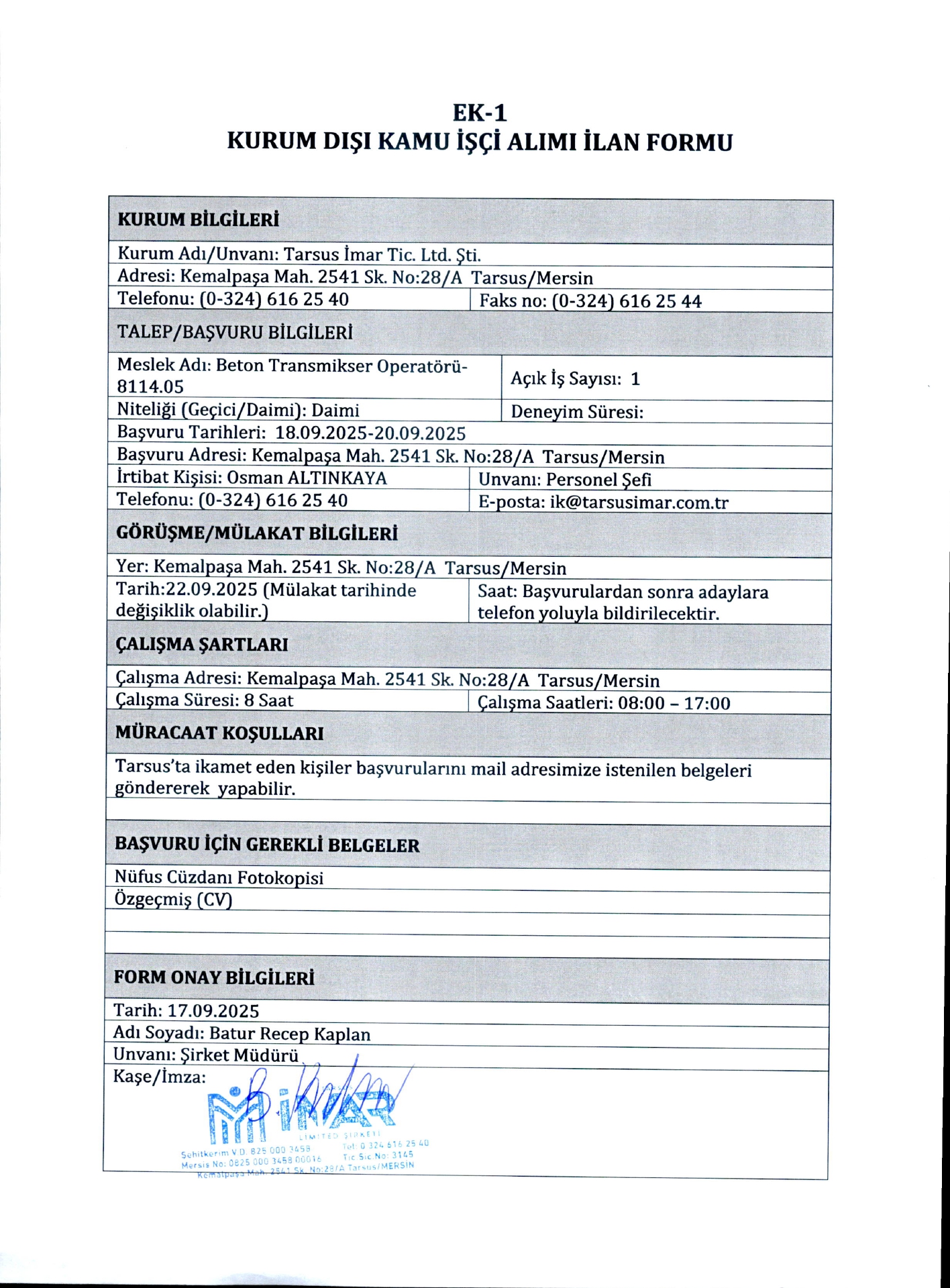 Mersin Tarsus İmar 1 İşçi Alacak. Son başvuru tarihi 20 Eylül 2025