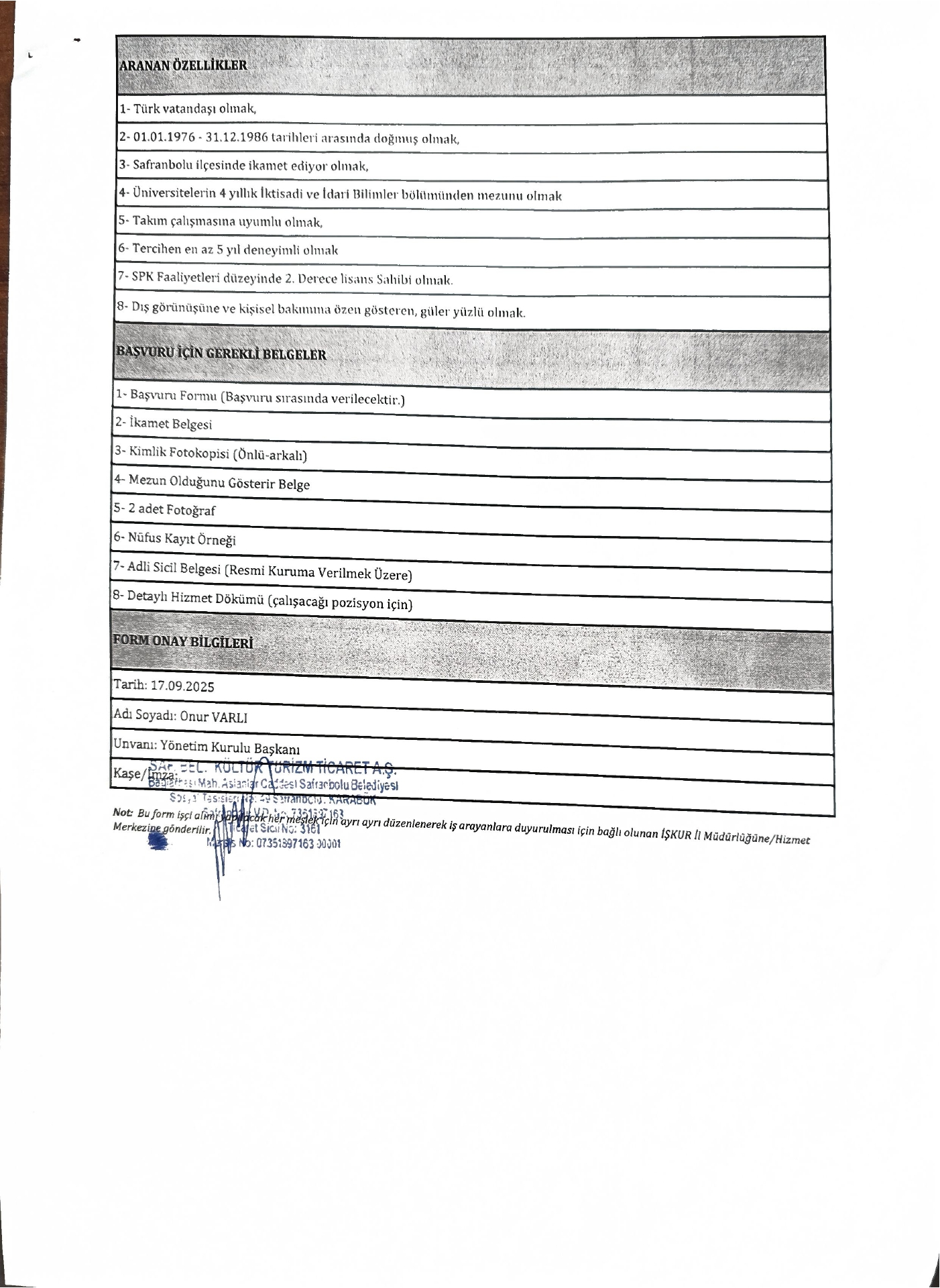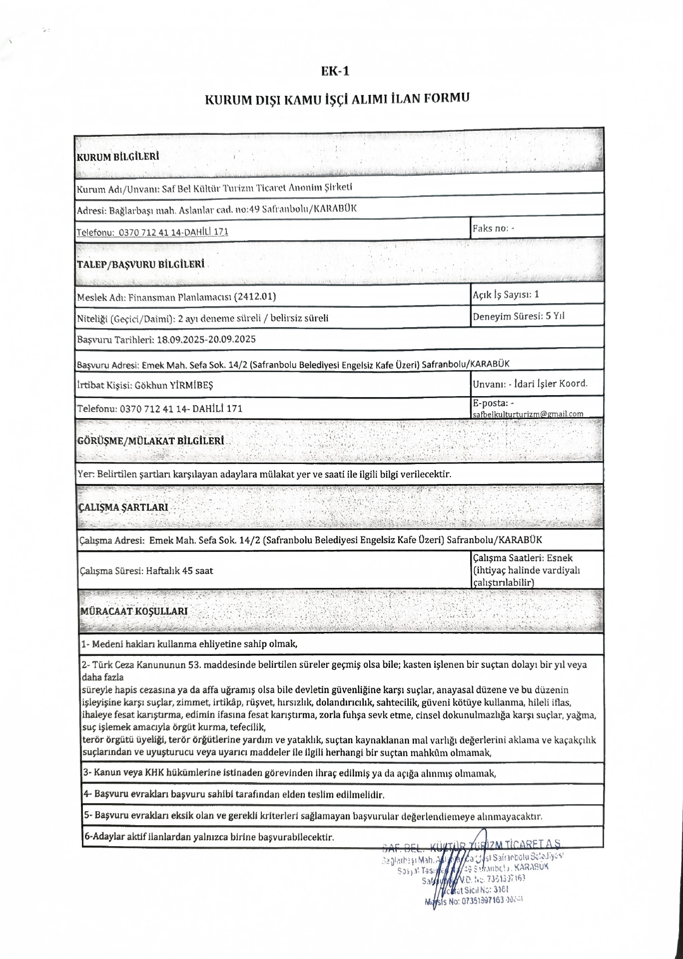 Karabük Saf-Bel 1 İşçi Alacak. Son başvuru tarihi 20 Eylül 2025