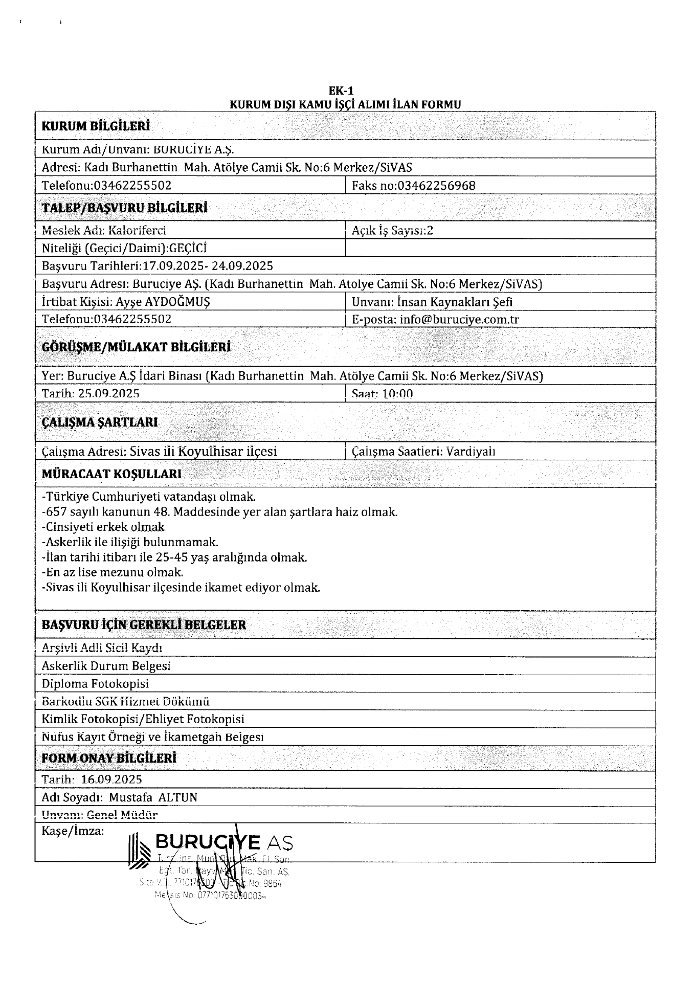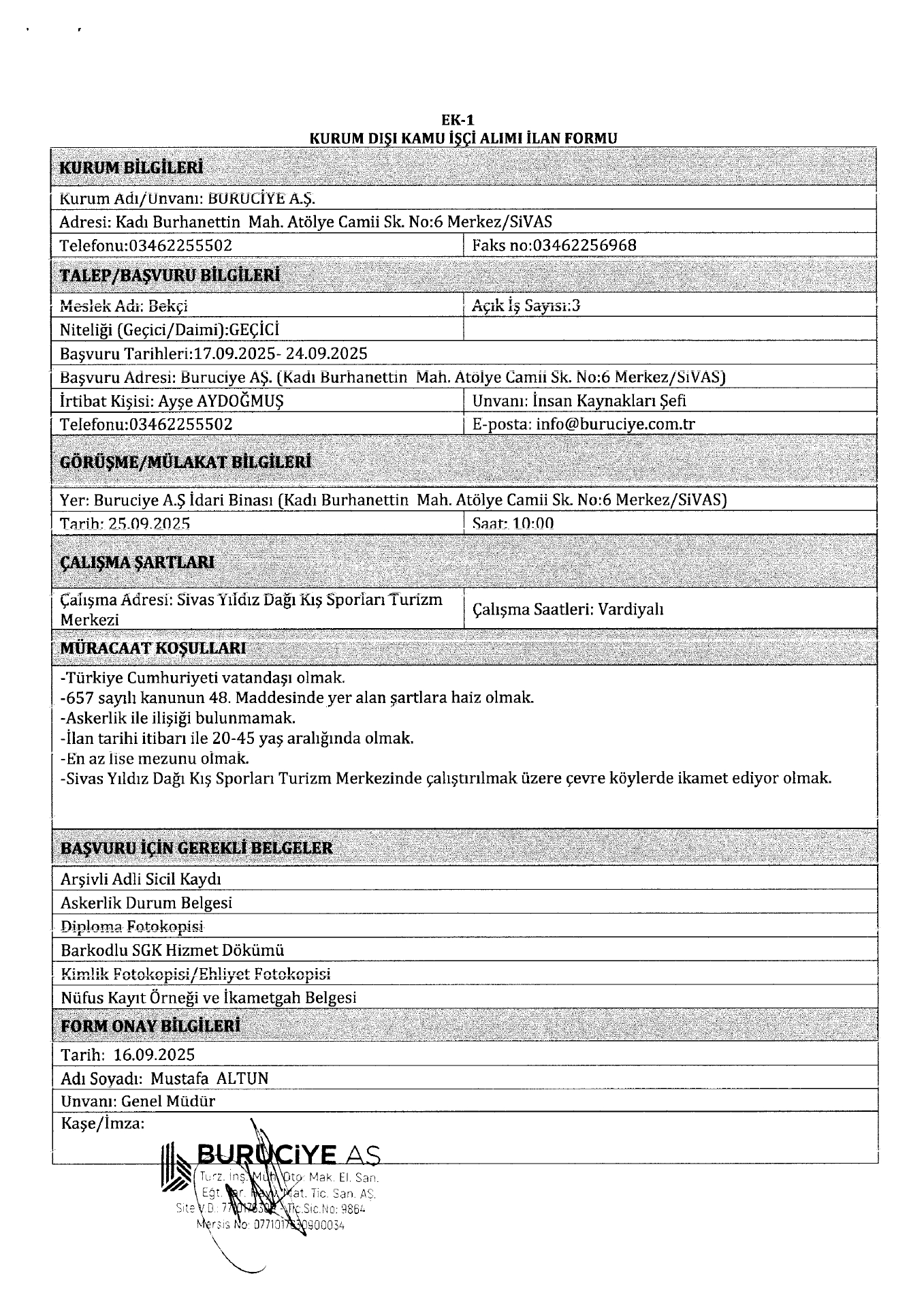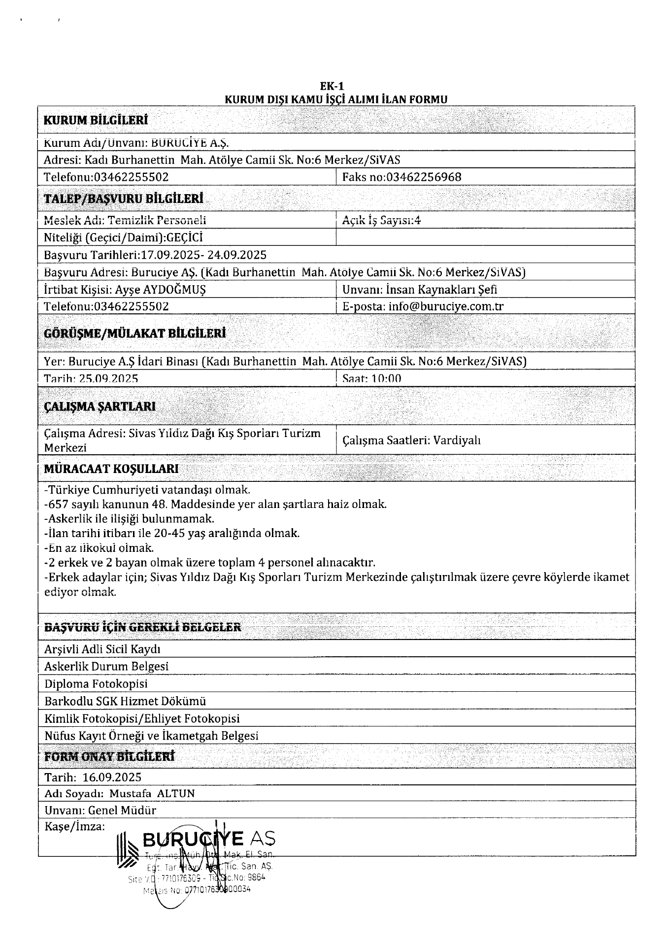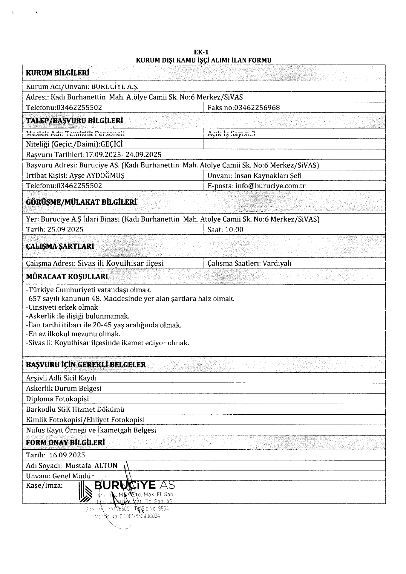 Sivas Buruciye Aş. Geçici 17 İşçi Alacak. Son başvuru tarihi 24 Eylül 2025