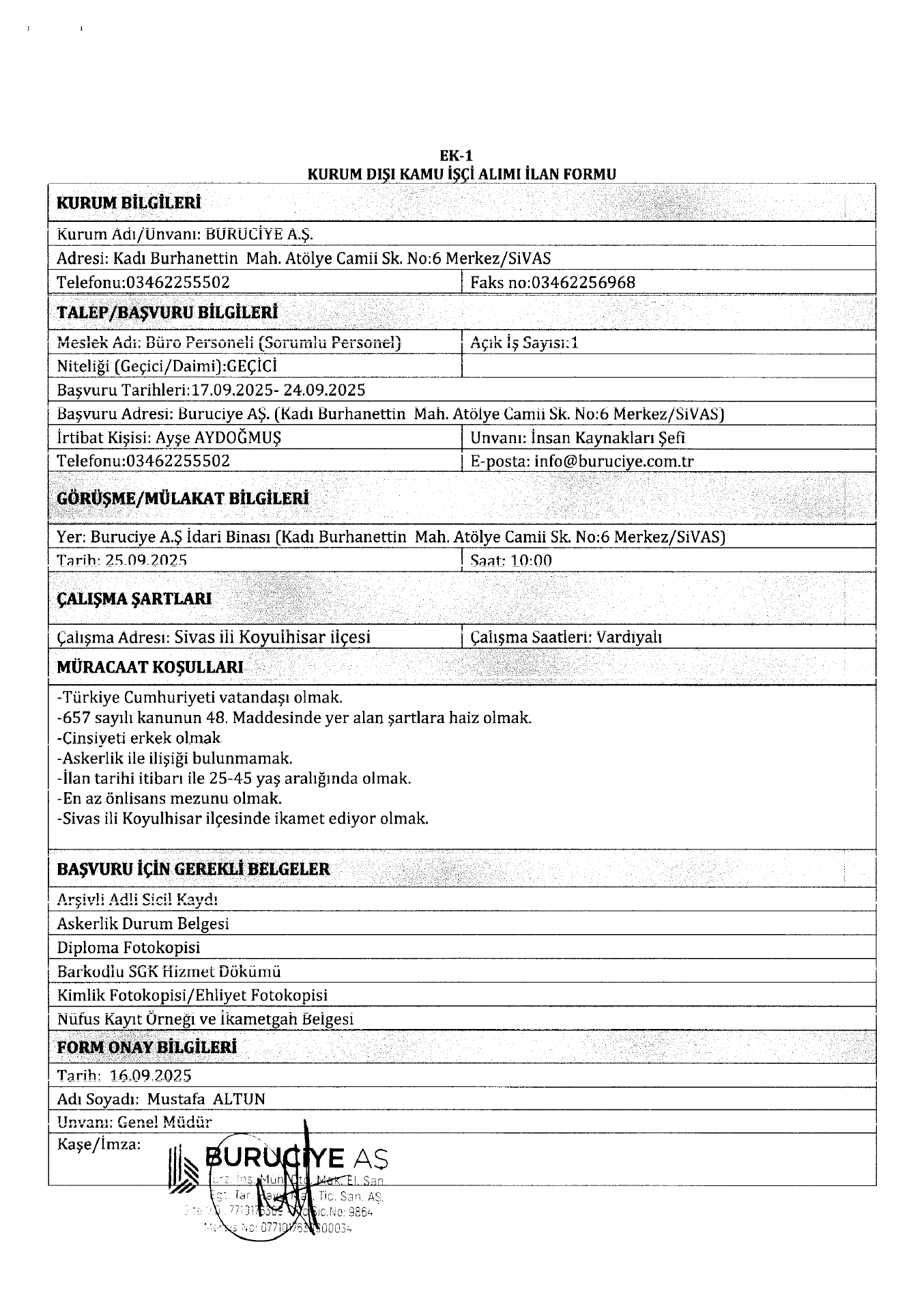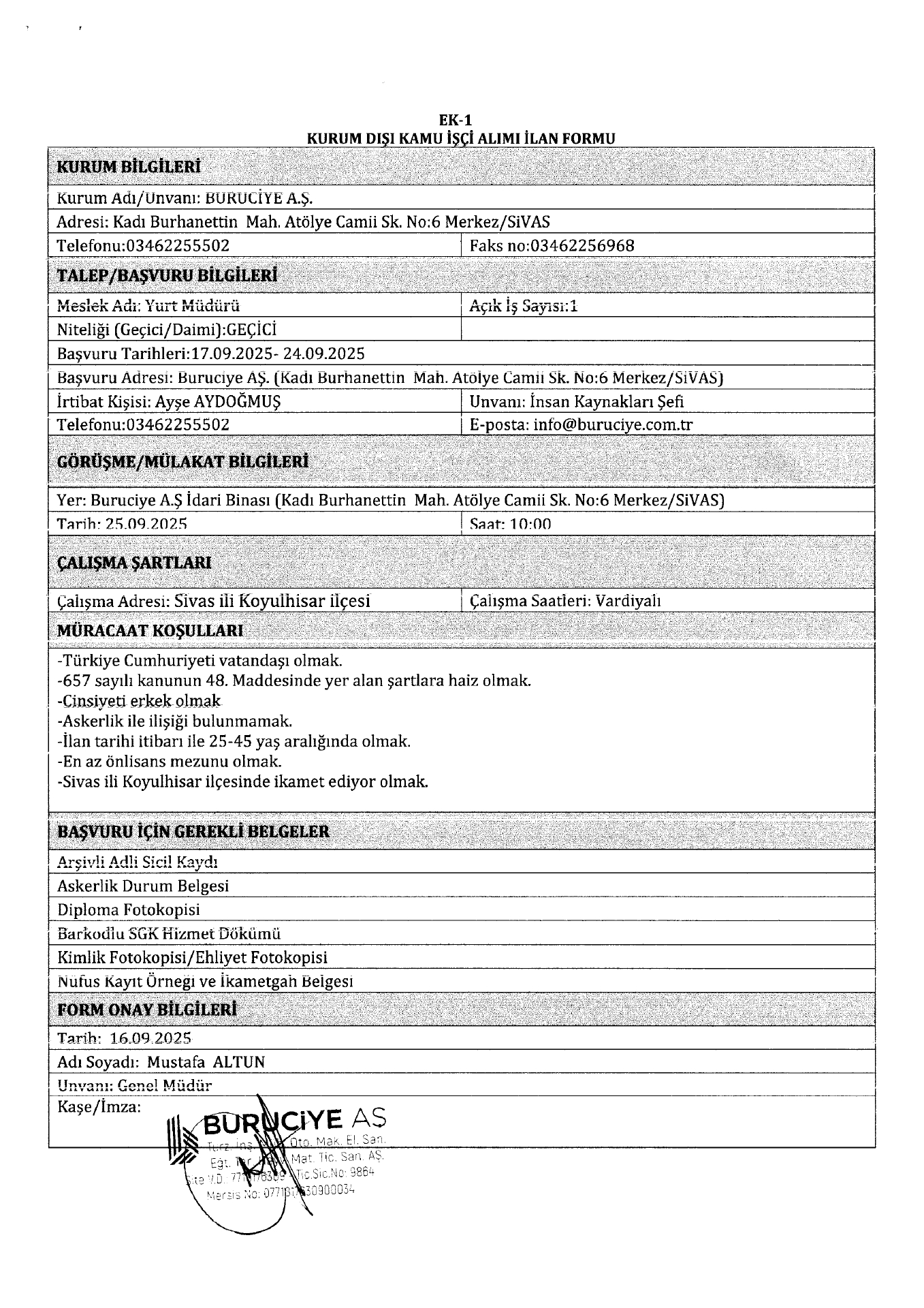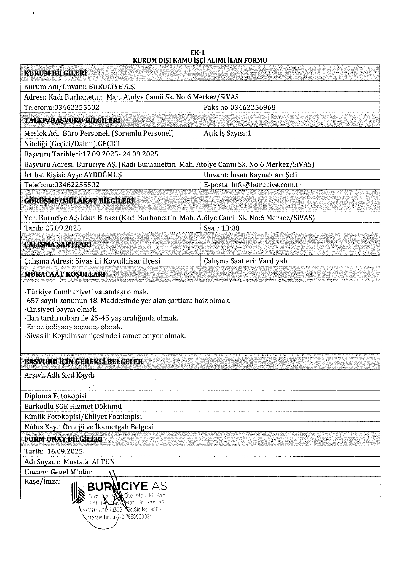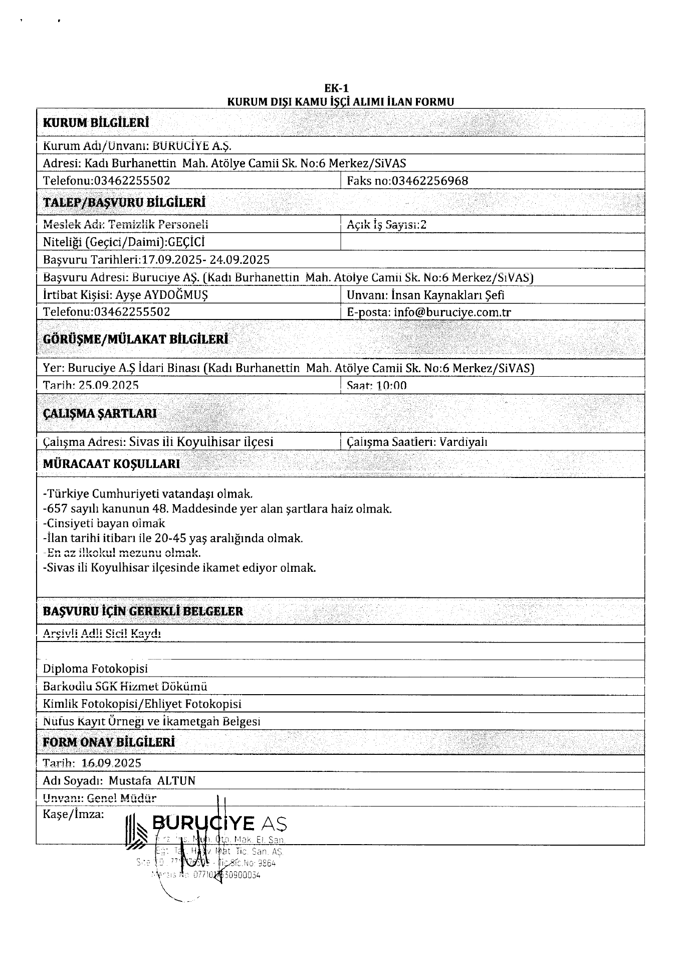 Sivas Buruciye Aş. Geçici 17 İşçi Alacak. Son başvuru tarihi 24 Eylül 2025