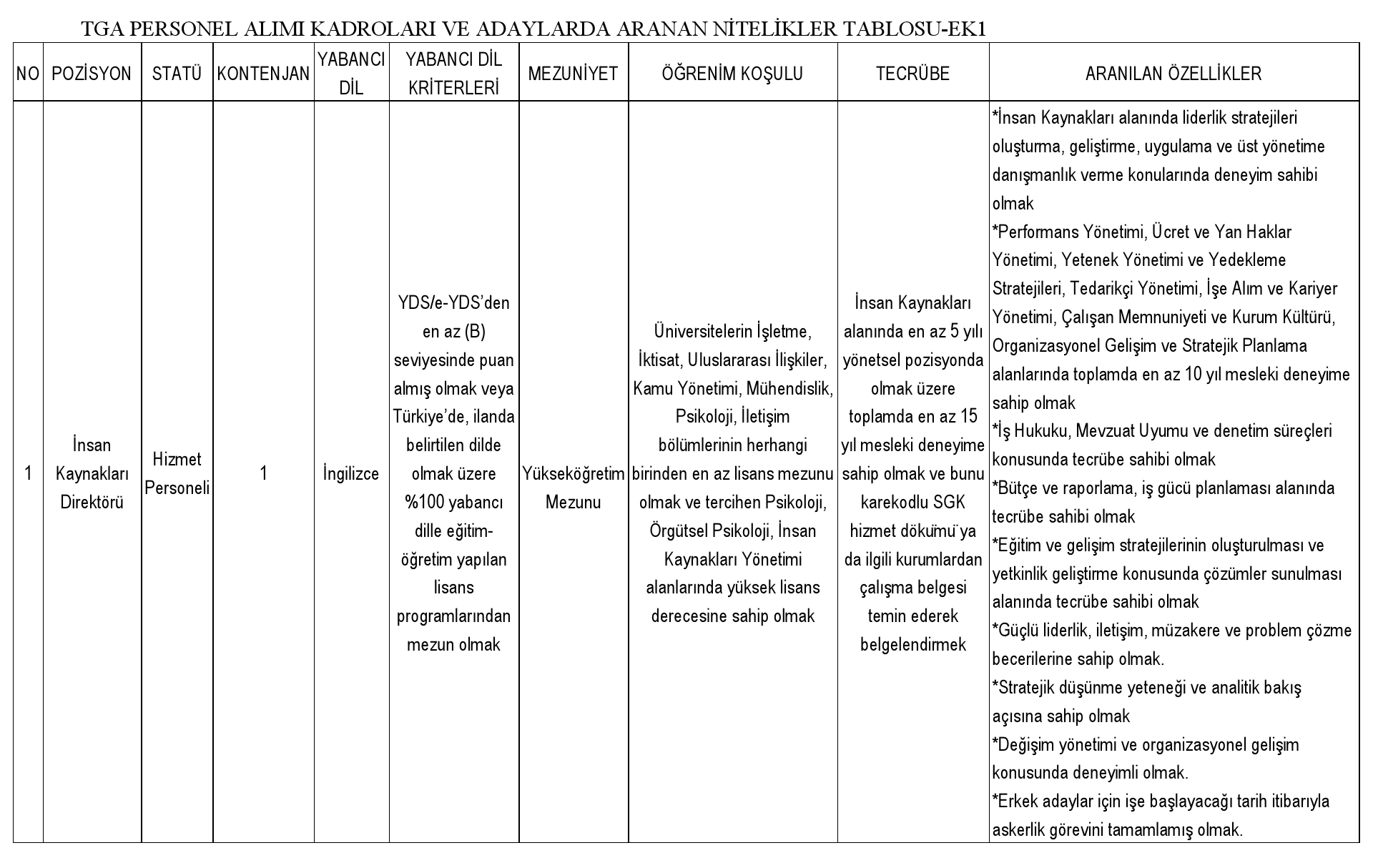 c)Adayların bu ilanın ekinde yer alan TGA Personel Alımı Kadroları ve Adaylarda Aranan Nitelikler Tablosundaki (Ek-1) her bir pozisyon için belirtilen özel koşulları taşımaları gerekmektedir.