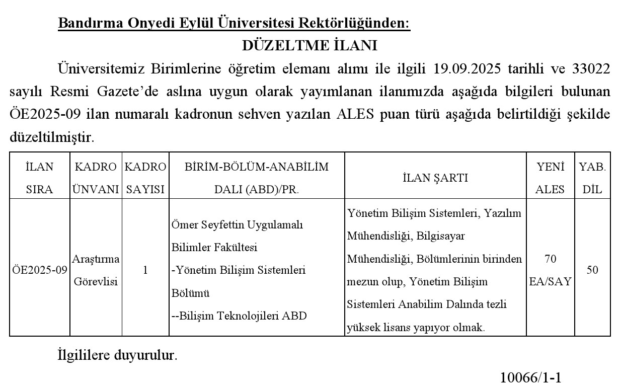 Bandırma Onyedi Eylül Üniversitesi Öğretim Üyesi ve Elemanı Alım İlanı. Son başvuru tarihi 3 Ekim 2025