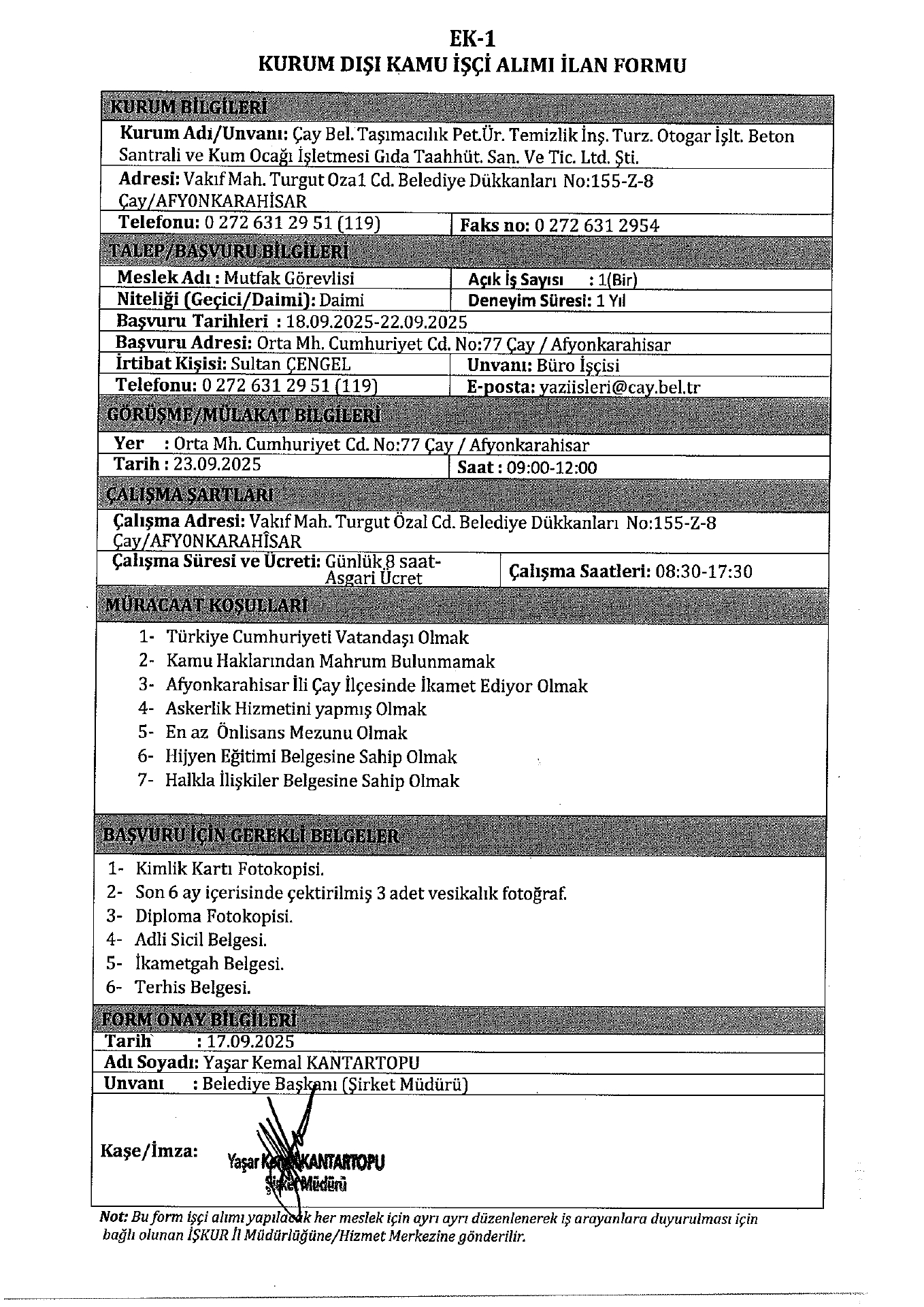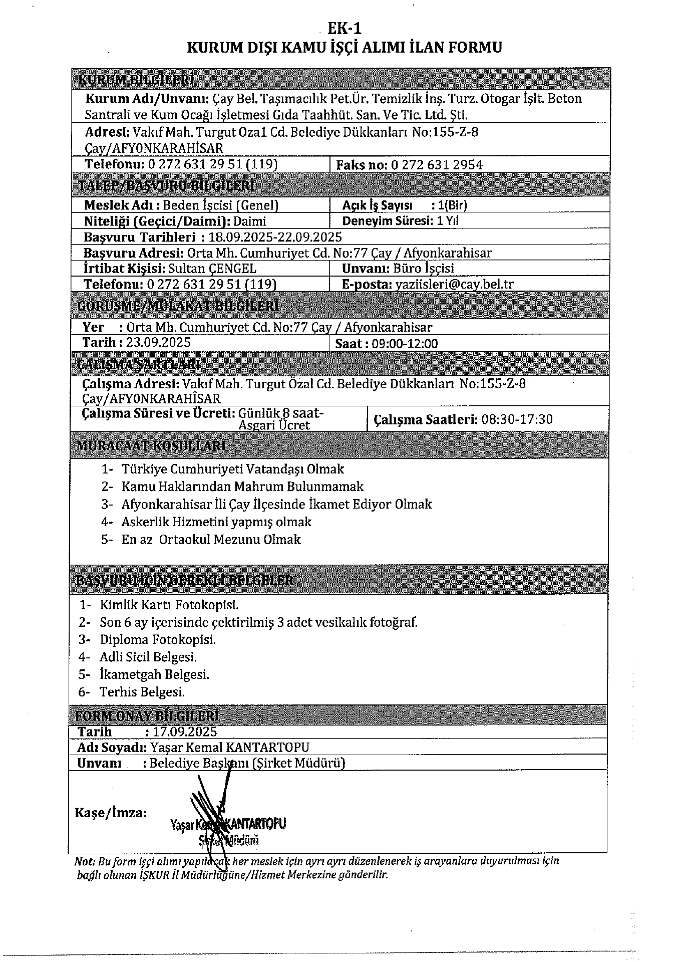 Afyonkarahisar Çaybel 2 İşçi Alacak. Son başvuru tarihi 22 Eylül 2025