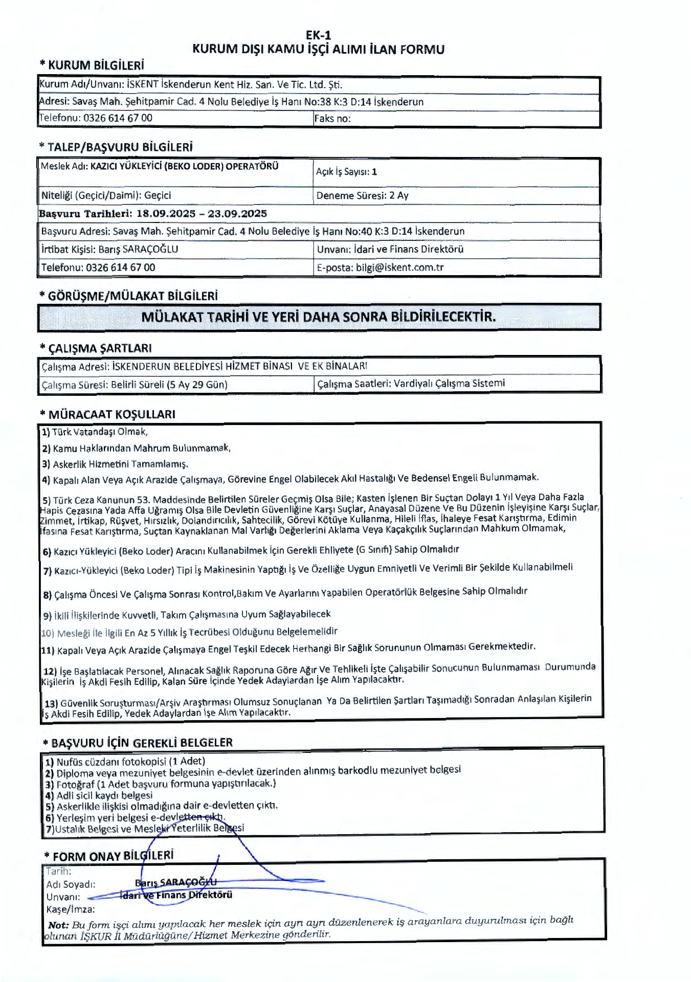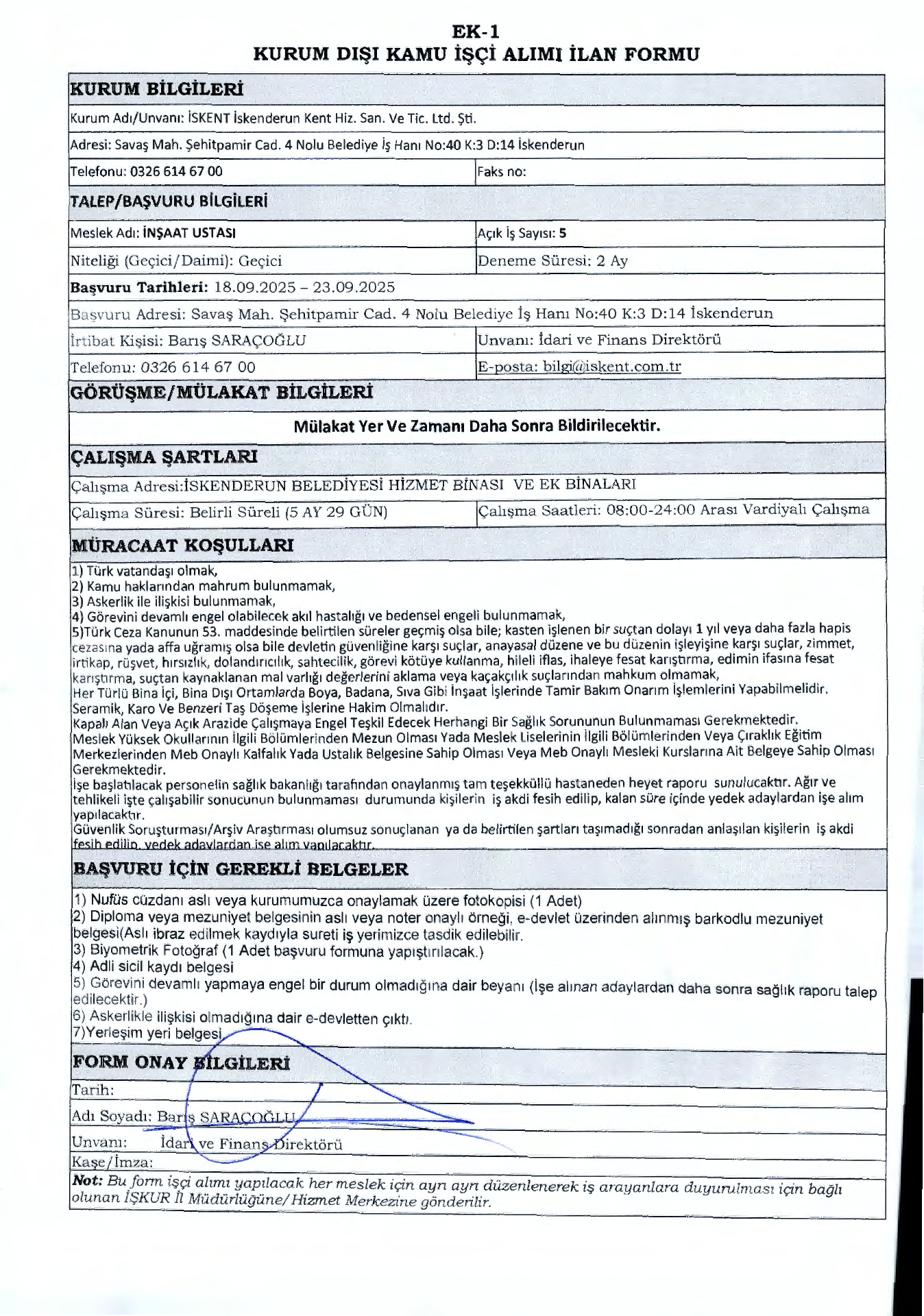 İskenderun İskent Geçici 6 İşçi Alacak. Son başvuru tarihi 23 Eylül 2025