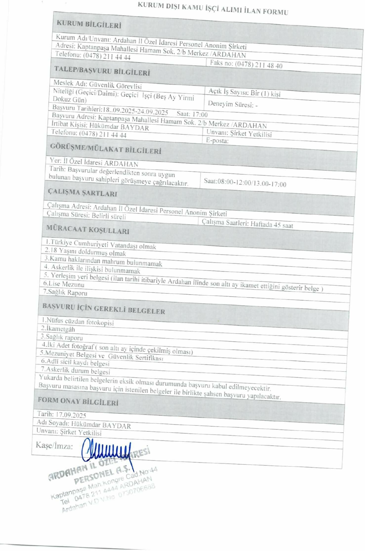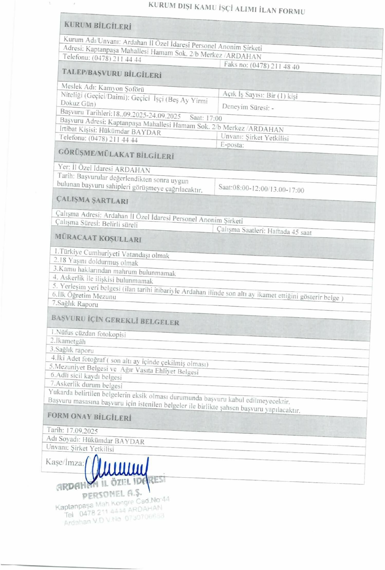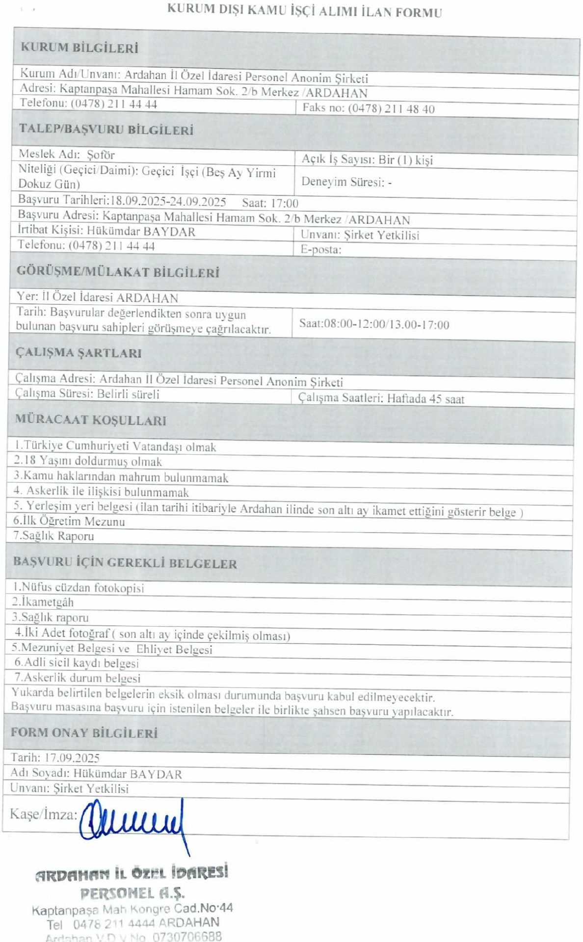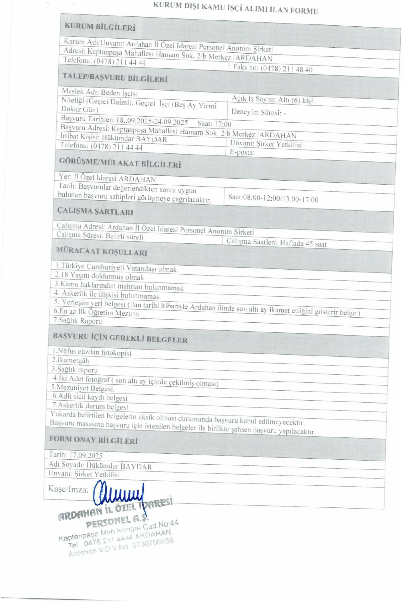 Ardahan İl Özel İdaresi Geçici 9 İşçi Alacak. Son başvuru tarihi 24 Eylül 2025