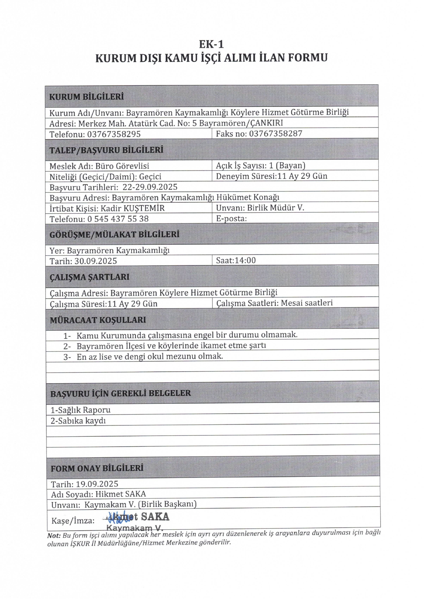 Çankırı Bayramören Kaymakamlığı Geçici 1 İşçi Alacak. Son başvuru tarihi 22 Eylül 2025