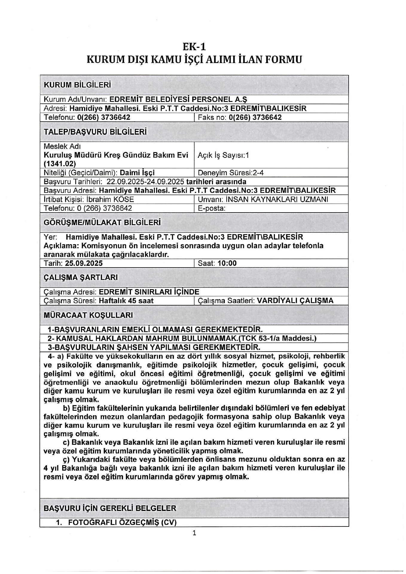 Balıkesir Edremit Belediyesi 1 İşçi Alacak. Son başvuru tarihi 22 Eylül 2025