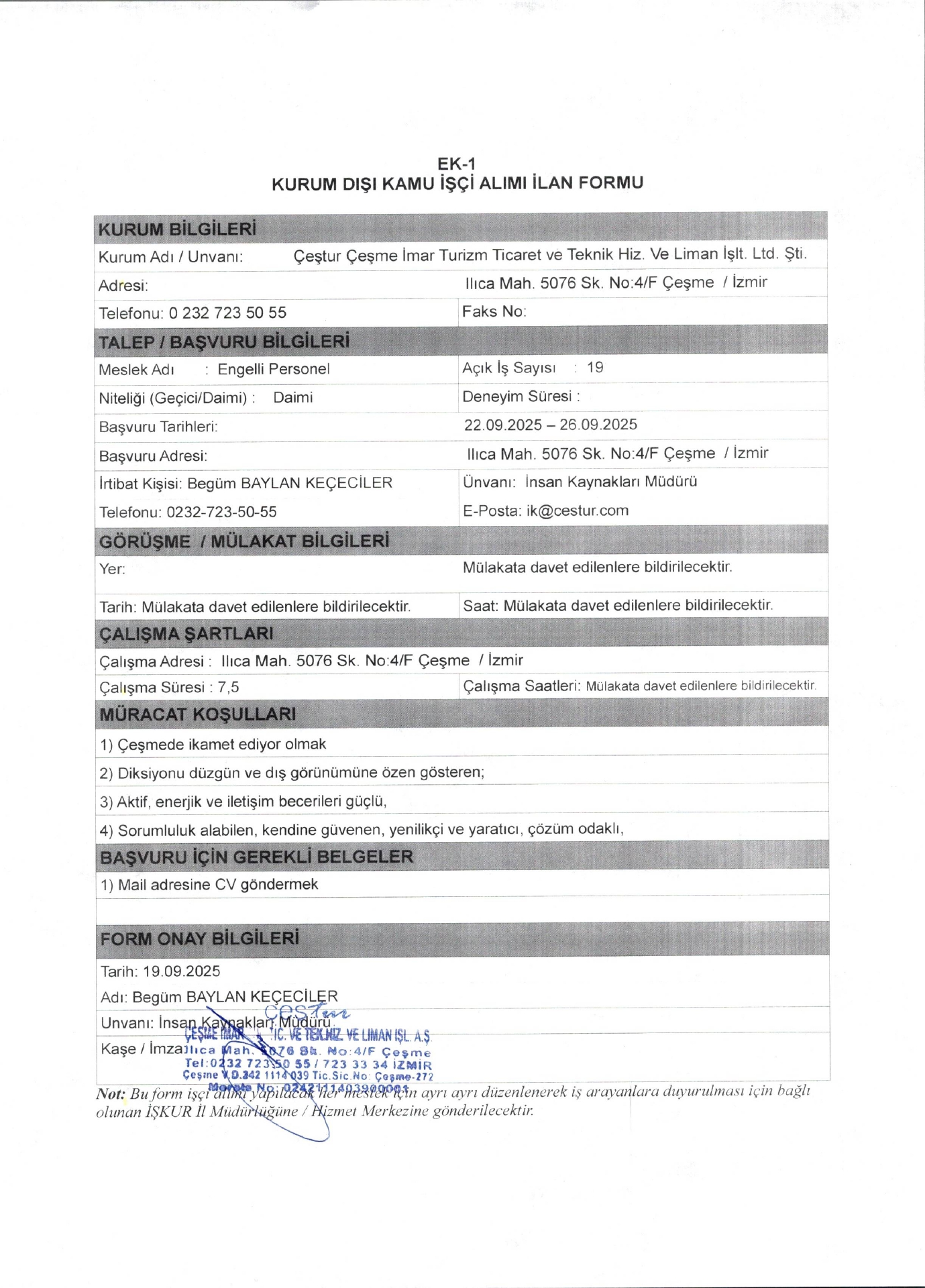 İzmir Çeştur 19 İşçi Alacak. Son başvuru tarihi 26 Eylül 2025