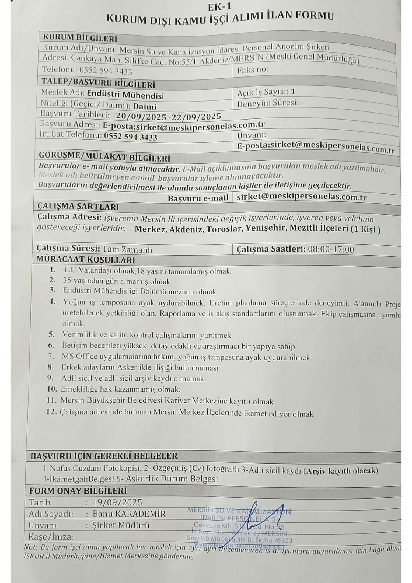 Mersin Su ve Kanalizasyon İdaresi 1 İşçi Alacak. Son başvuru tarihi 22 Eylül 2025