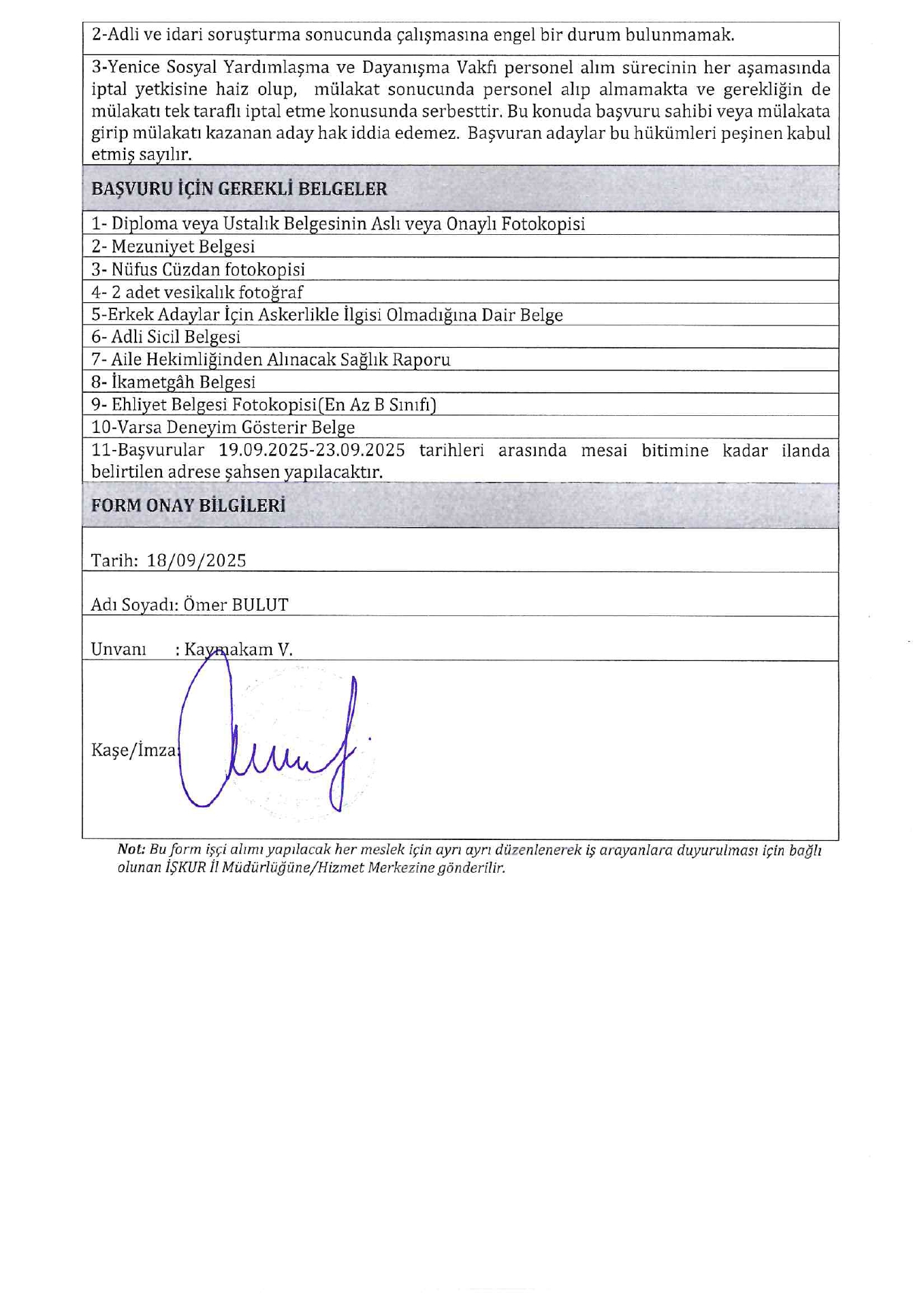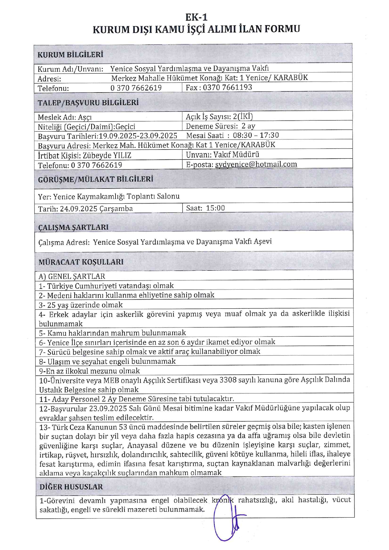 Karabük Yenice SYDV Geçici 2 İşçi Alacak. Son başvuru tarihi 23 Eylül 2025