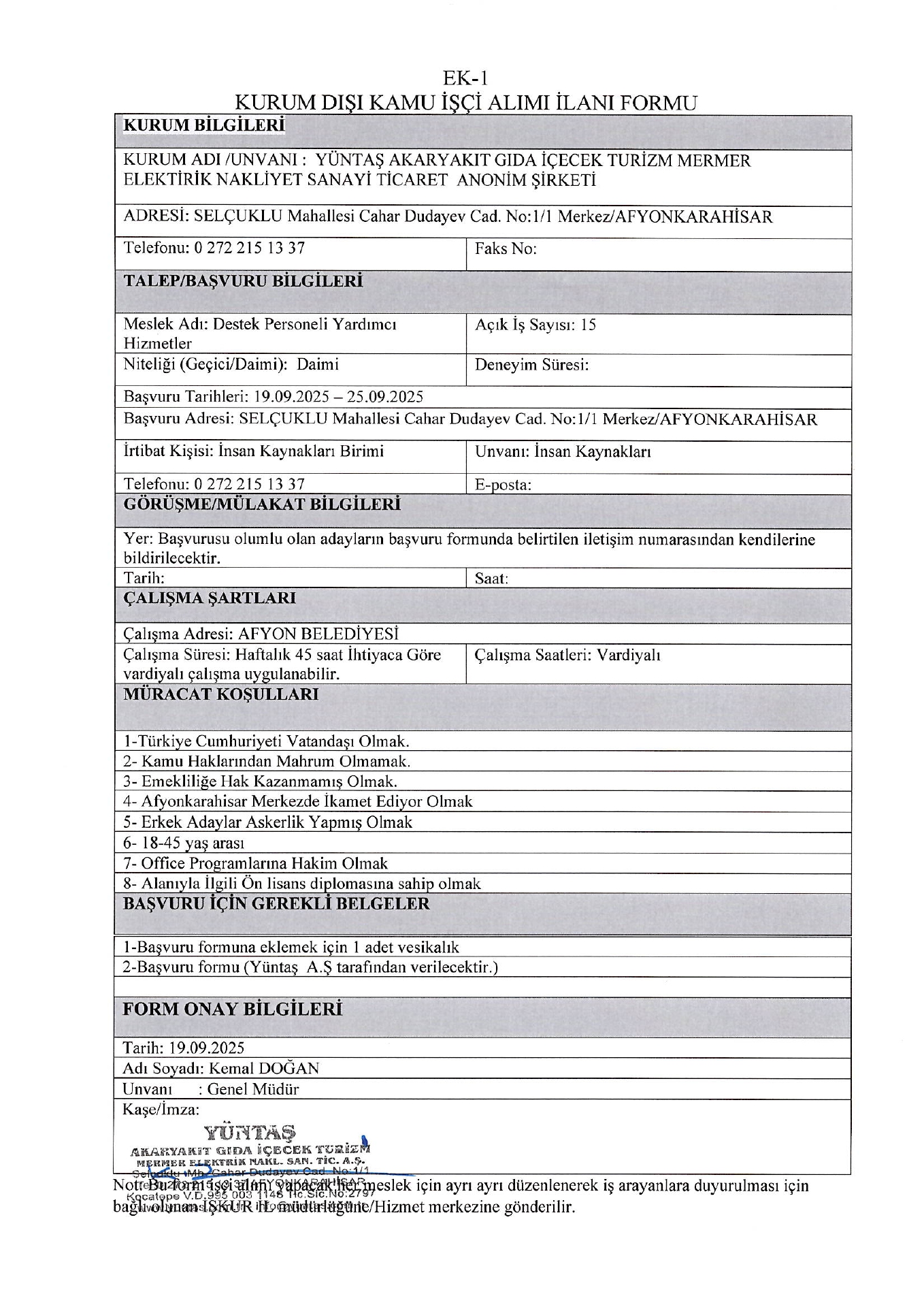Afyonkarahisar Yüntaş Akaryakıt 15 İşçi Alacak. Son başvuru tarihi 25 Eylül 2025