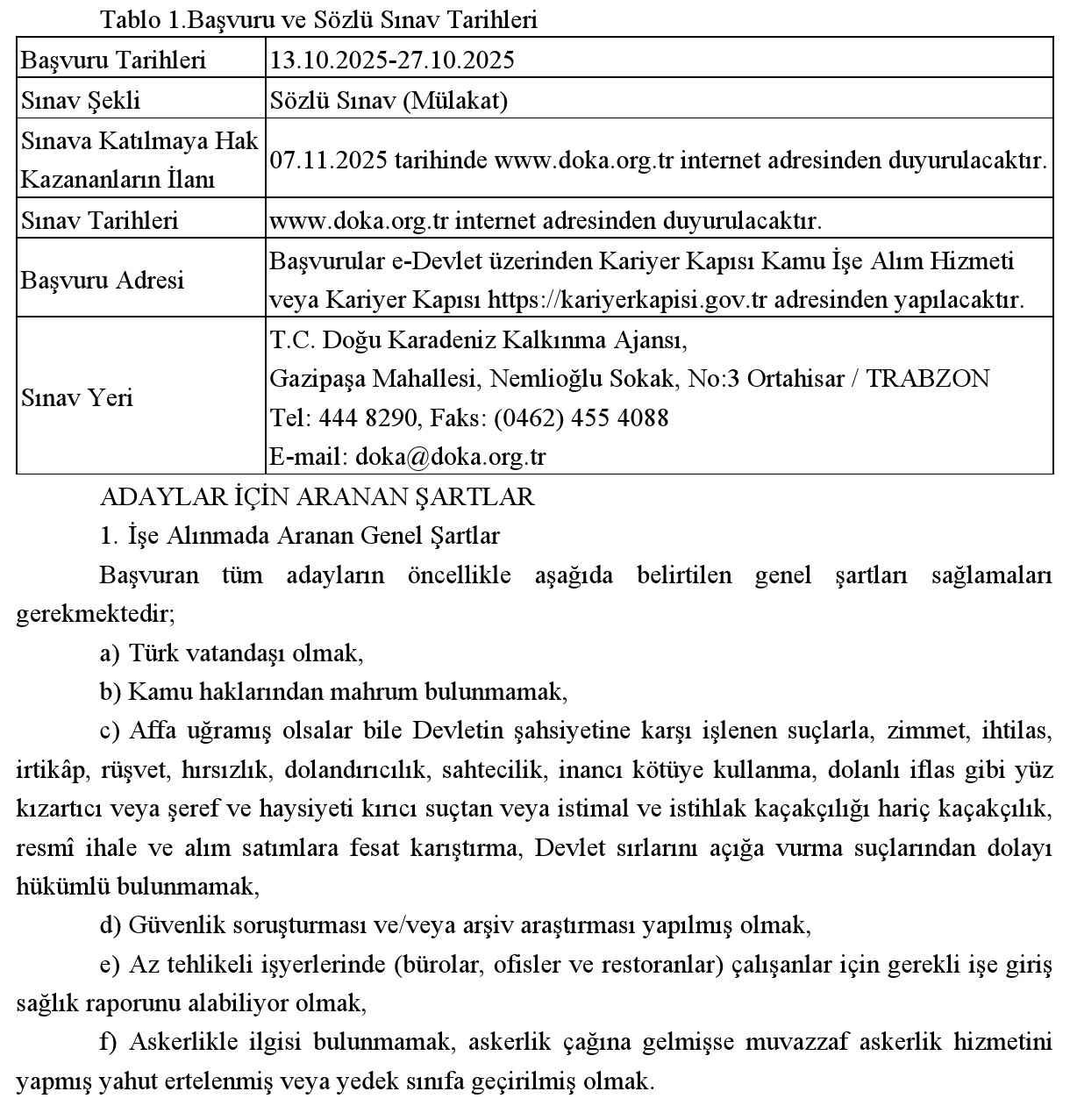 Doğu Karadeniz Kalkınma Ajansı 5 personel alacak. Son başvuru tarihi 27 Ekim 2025