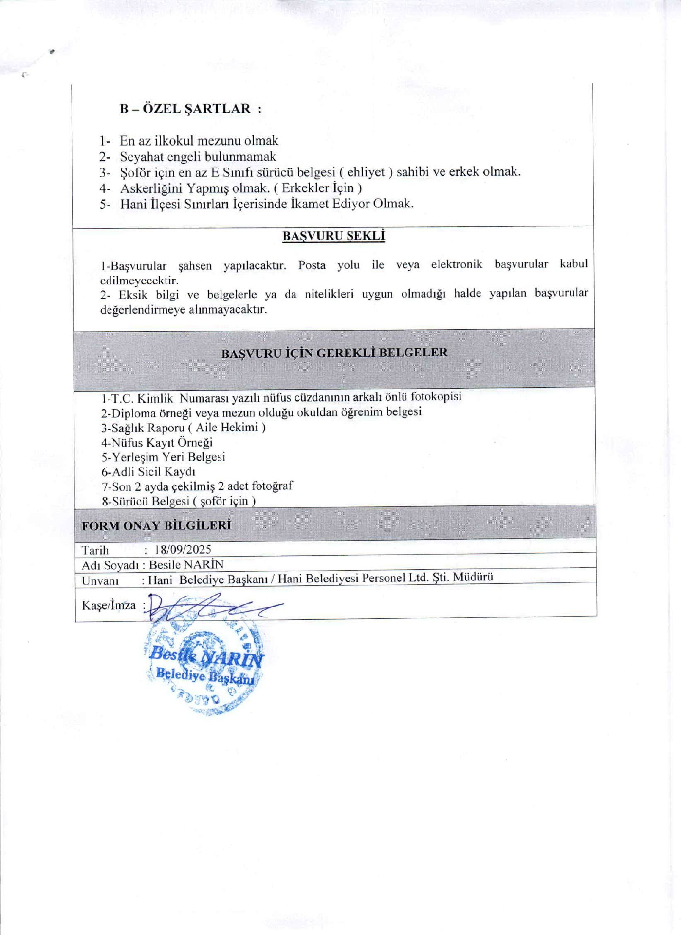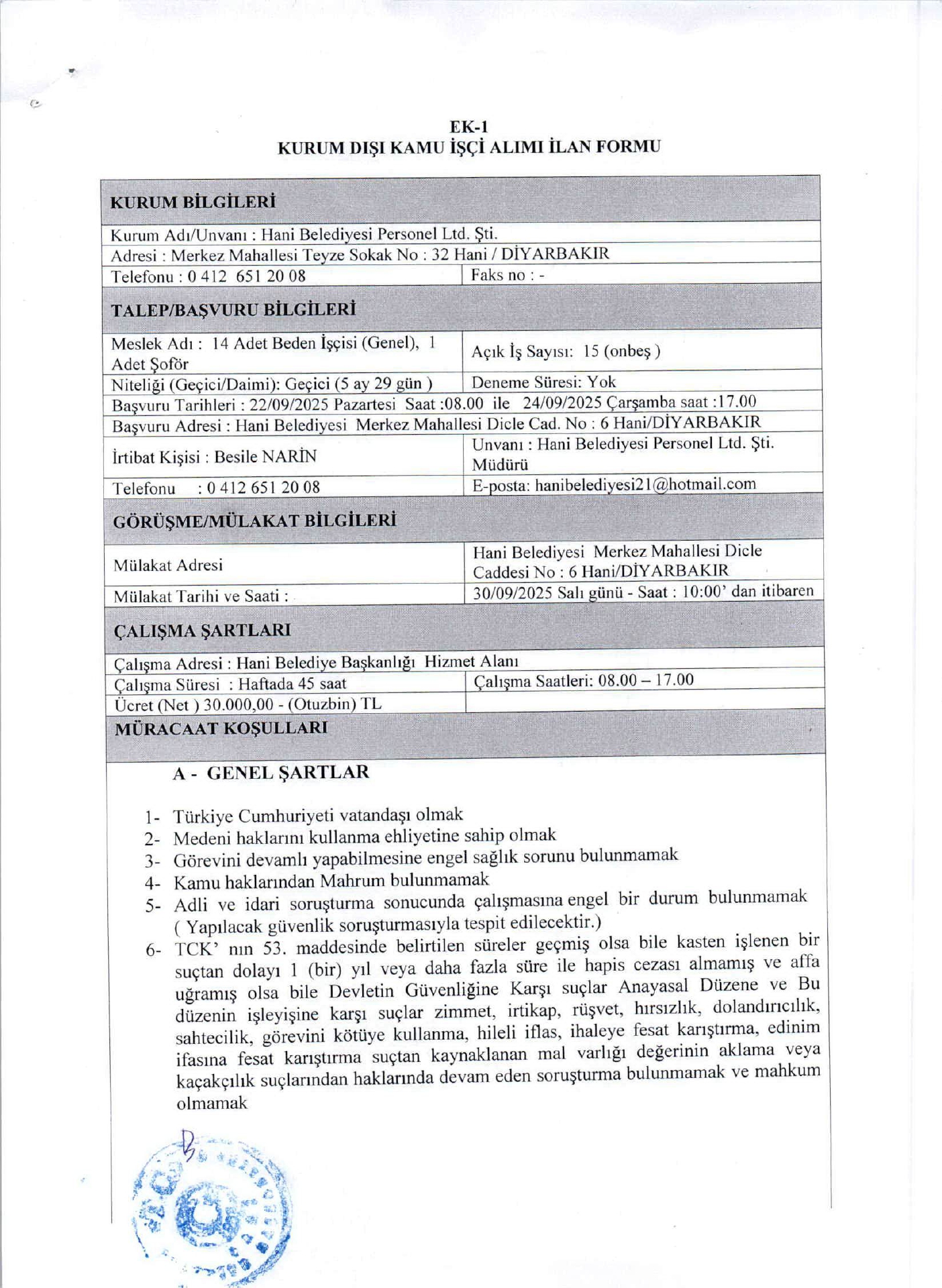 Diyarbakır Hani Belediyesi Geçici 15 İşçi Alacak. Son başvuru tarihi 24 Eylül 2025