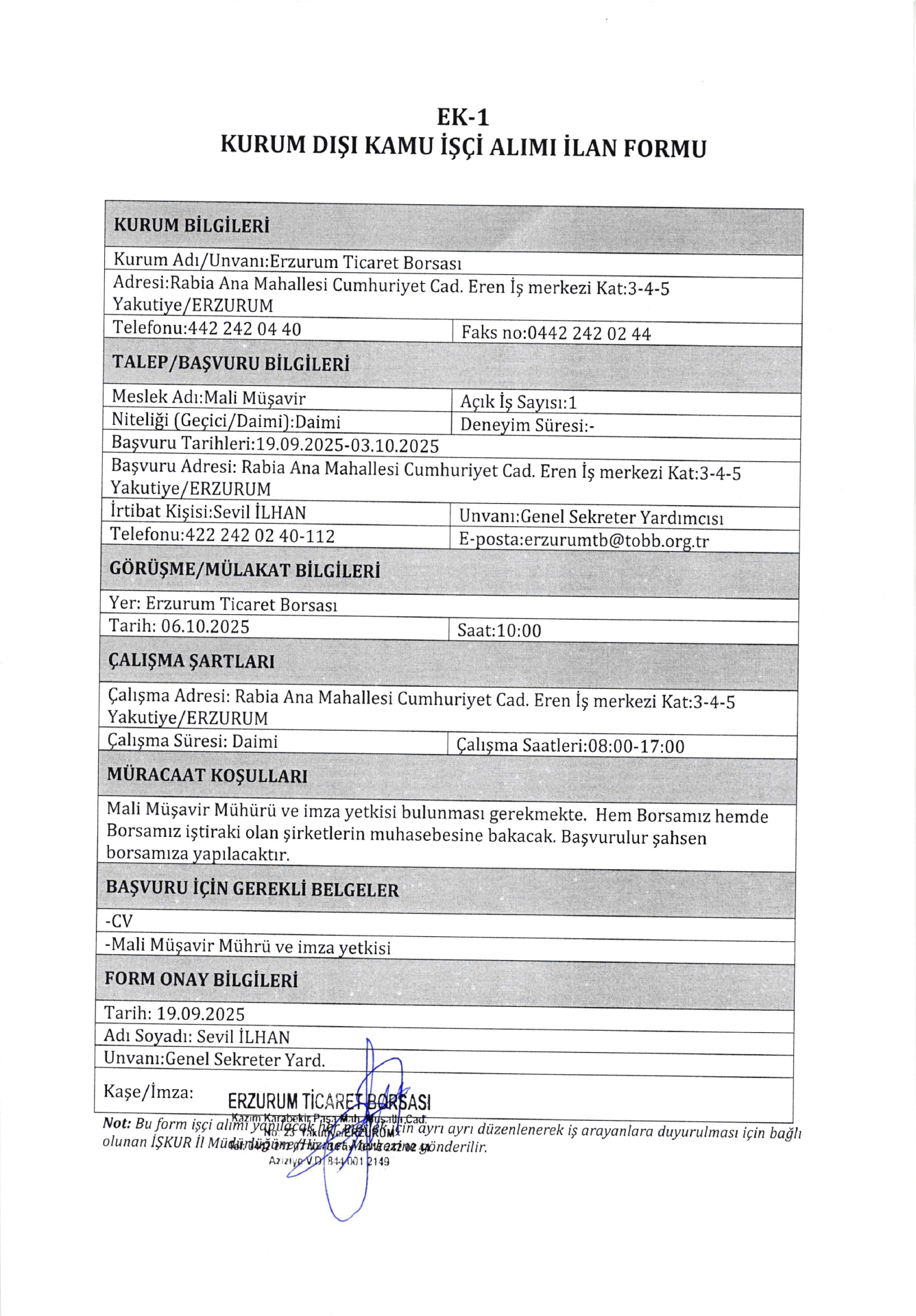 Erzurum Ticaret Borsası 1 İşçi Alacak. Son başvuru tarihi 3 Ekim 2025