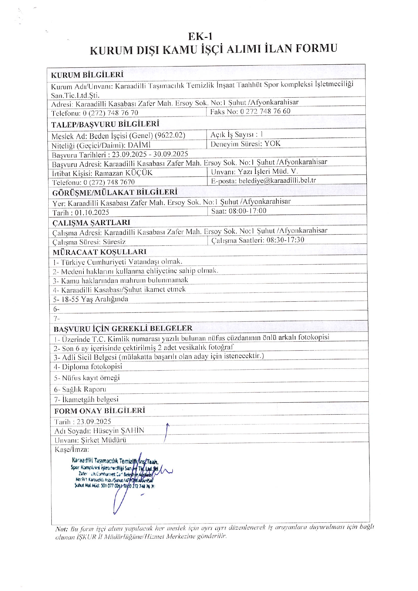 Afyonkarahisar Karaadilli Taşımacılık 1 İşçi Alacak. Son başvuru tarihi 30 eylül 2025