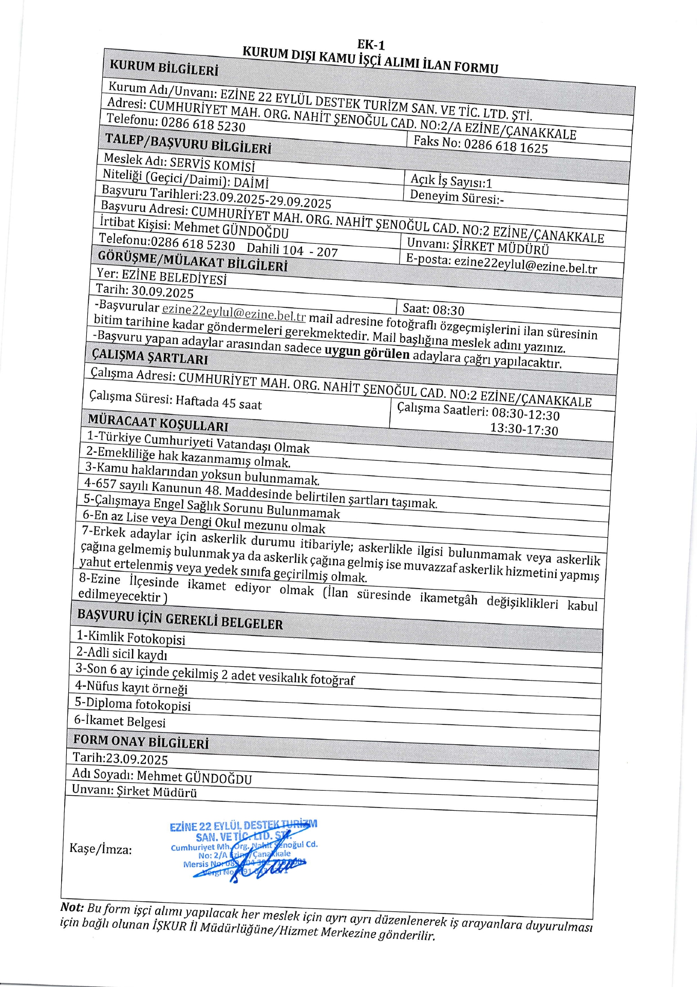 Çanakkale Ezine 22 Eylül Destek Turizm 2 İşçi Alacak. Son başvuru tarihi 29 eylül 2025