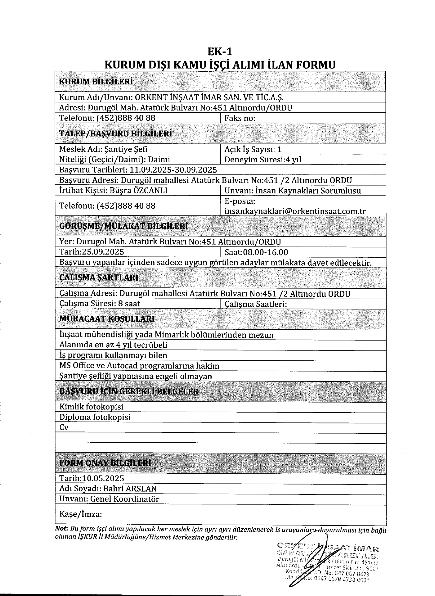 Ordu Orkent 1 İşçi Alacak. Son başvuru tarihi 30 Eylül 2025