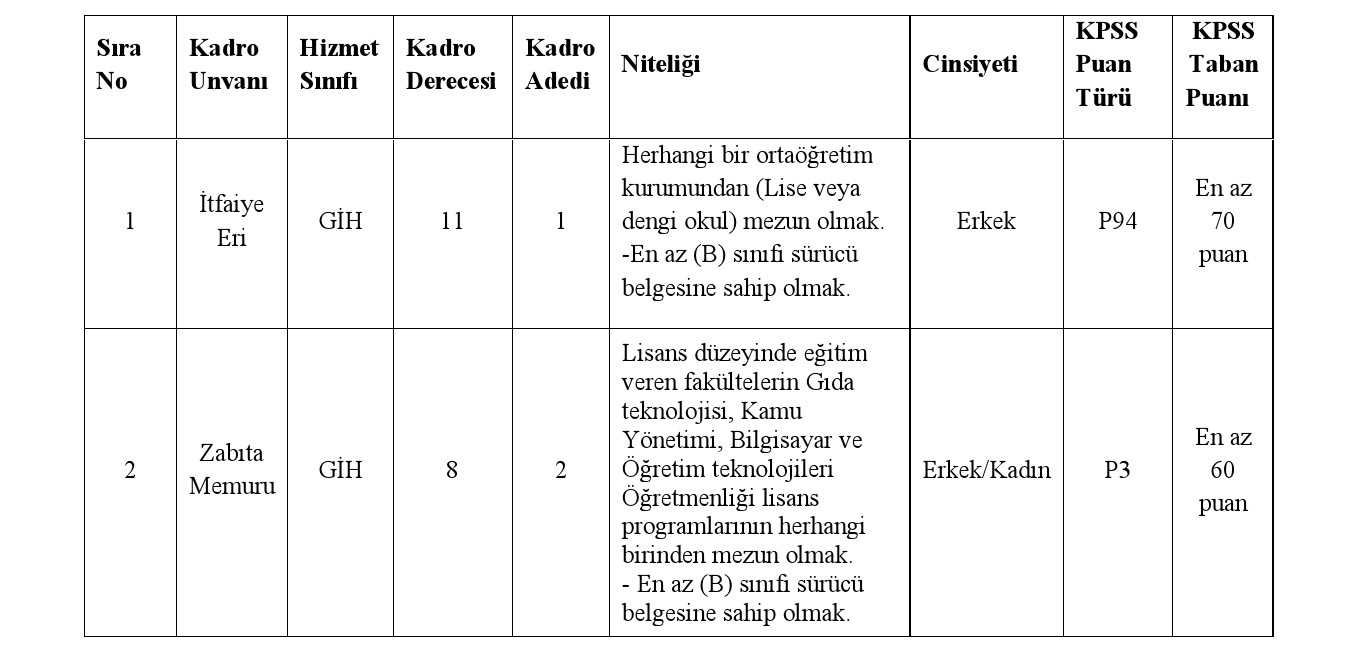Yozgat ili Kadışehri Belediye Başkanlığı bünyesinde, 657 sayılı Devlet Memurları Kanununa tabi olarak istihdam edilmek üzere; Belediye Zabıta Yönetmeliği ile Belediye İtfaiye Yönetmeliği hükümlerine göre aşağıda unvanı, sınıfı, derecesi, adedi, nitelikleri, KPSS puan türü, KPSS taban puanı ve diğer şartları taşımak kaydıyla belirtilen boş kadrolara açıktan atama yoluyla zabıta memuru ve itfaiye eri alınacaktır.