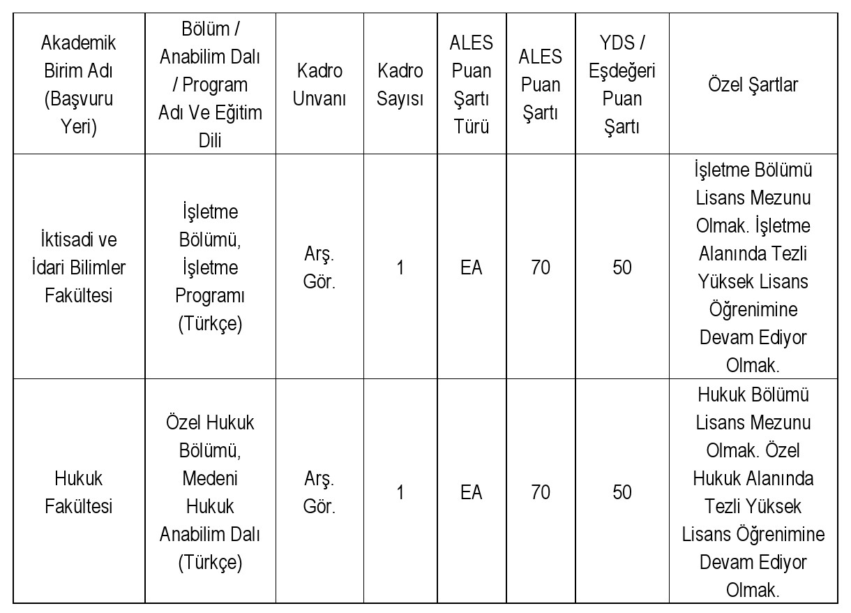 (İlanla İlgili Kadroya Başvuru Yapılacak Fakülte / Rektörlüğe Bağlı Bölüm / MYO Sekreterliği İle Görüşülmesi Gerekmektedir.)