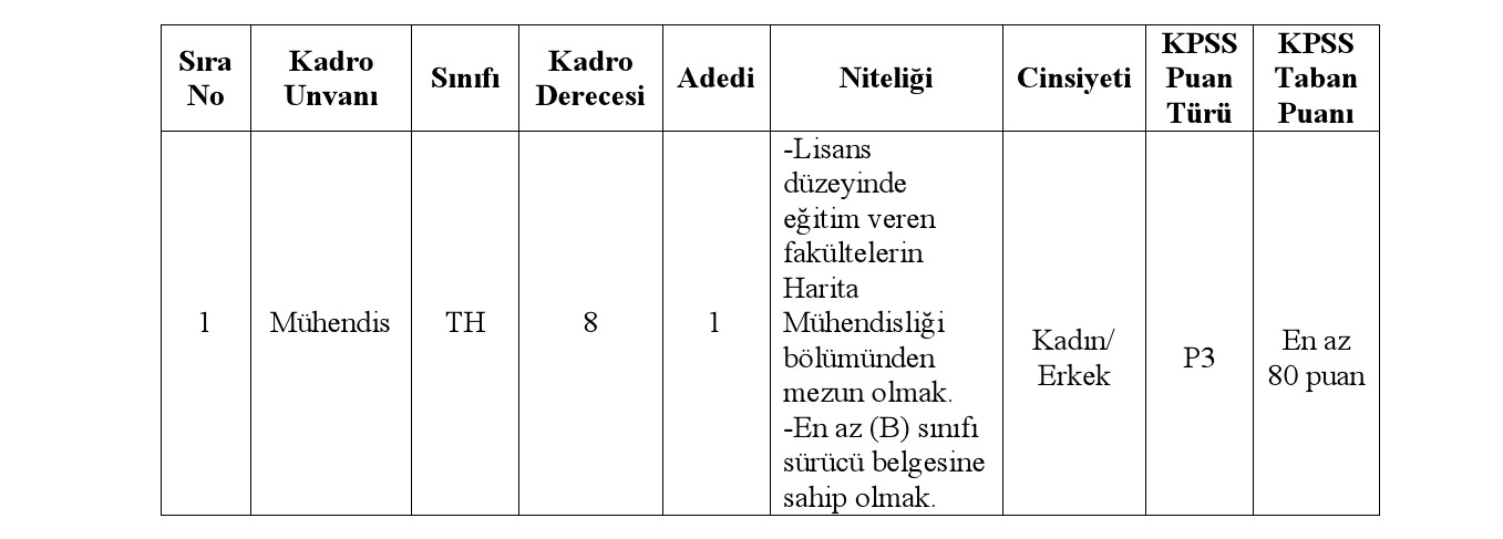 Düzce ili Yığılca Belediye Başkanlığı bünyesinde, 657 sayılı Devlet Memurları Kanununa tabi olarak istihdam edilmek üzere; Mahalli İdarelere İlk Defa Atanacaklara Dair Sınav ve Atama Yönetmeliği hükümlerine göre aşağıda unvanı, sınıfı, derecesi, adedi, nitelikleri, KPSS puan türü, KPSS taban puanı ve diğer şartları taşımak kaydıyla, belirtilen boş kadroya açıktan atama yoluyla memur alınacaktır.