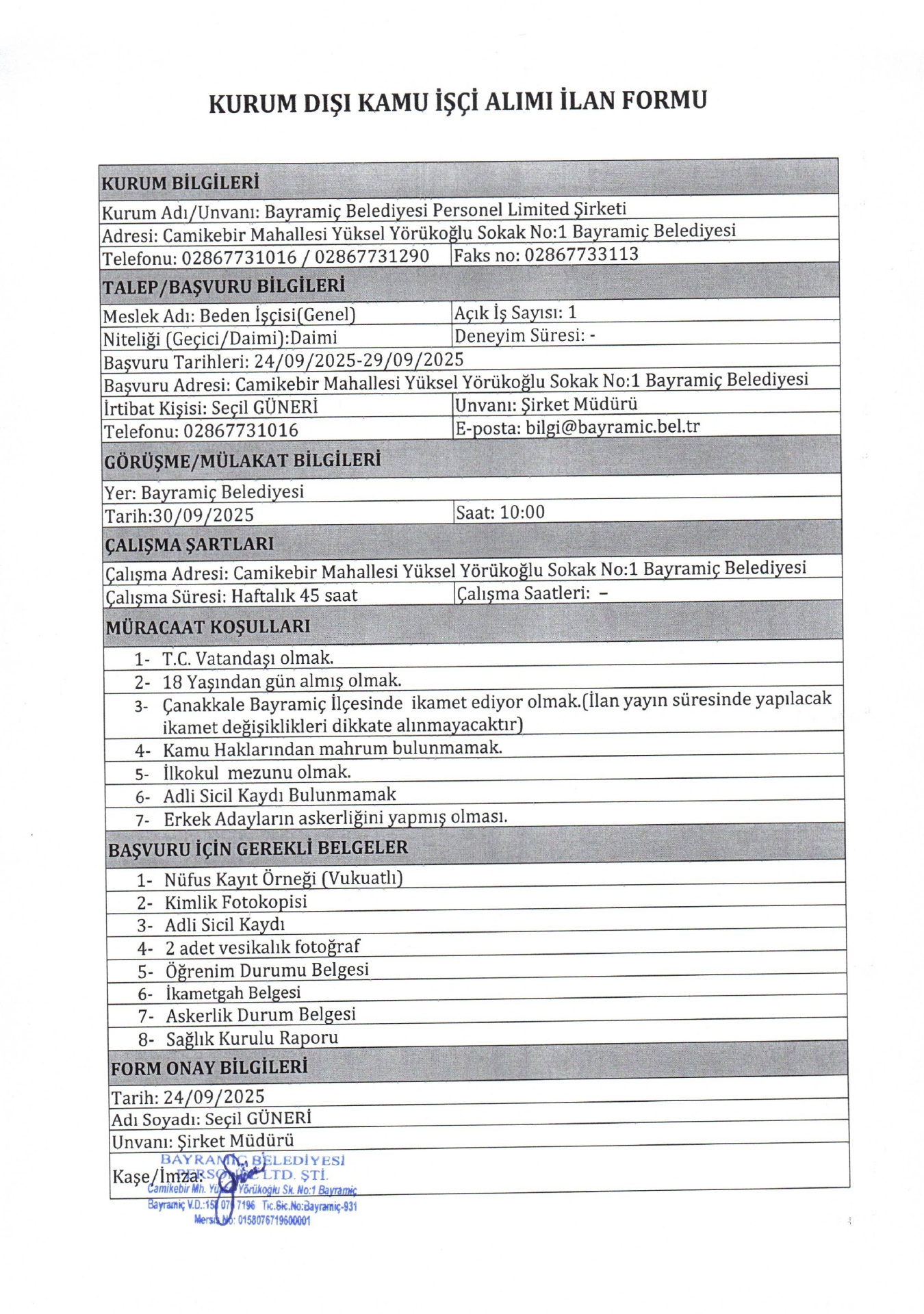 Çanakkale Bayramiç Belediyesi 1 İşçi Alacak. Son başvuru tarihi 29 Eylül 2025