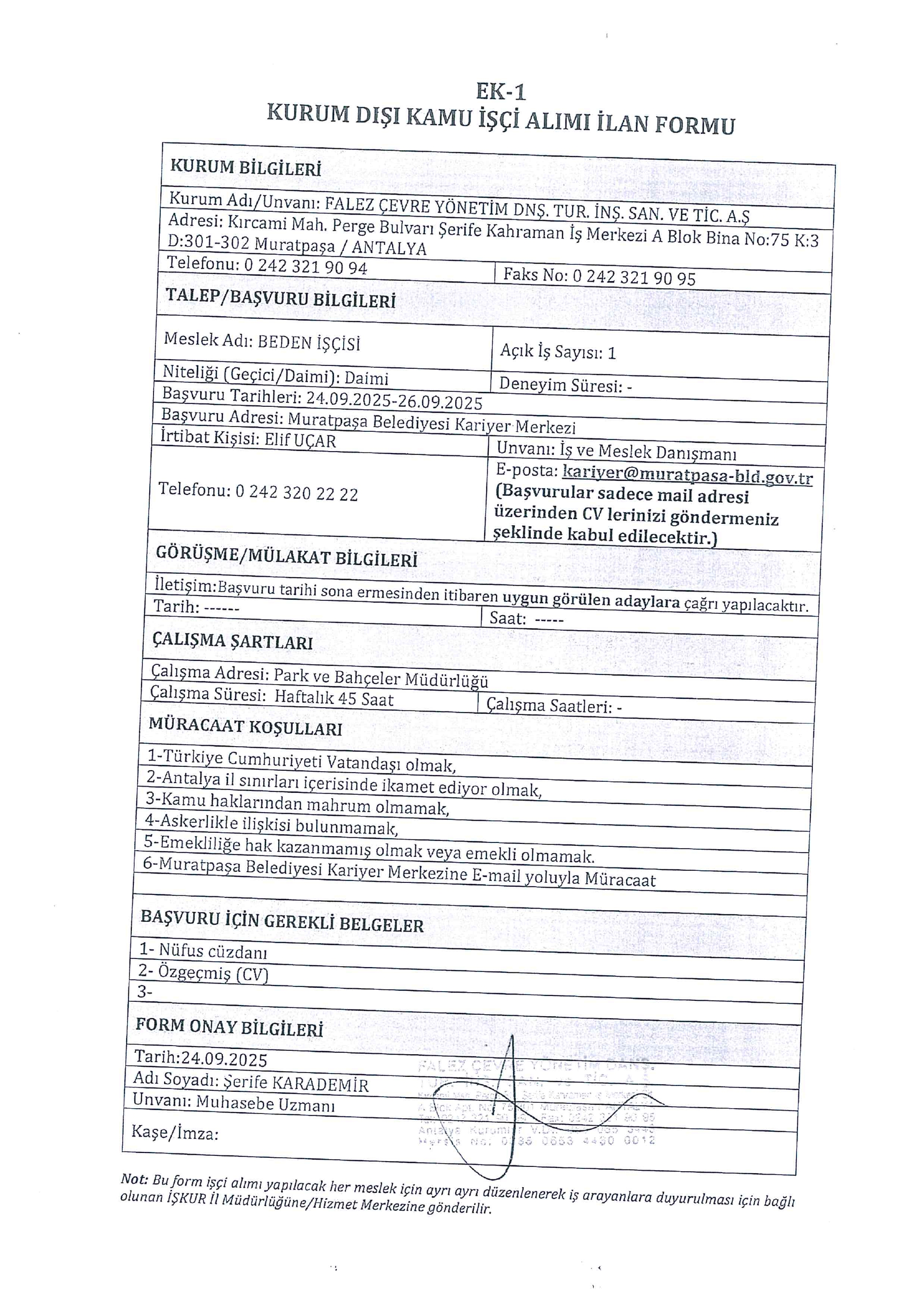 Antalya Falez Çevre Yönetim 1 İşçi Alacak. Son başvuru tarihi 26 Eylül 2025