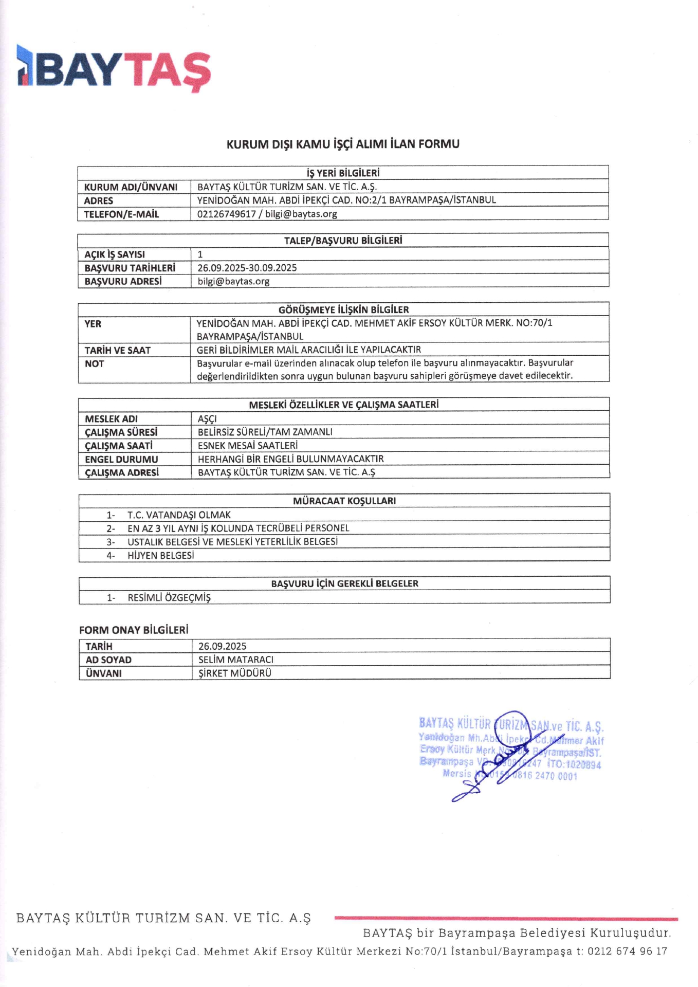 İstanbul Beytaş 1 İşçi Alacak. Son başvuru tarihi 30 Eylül 2025