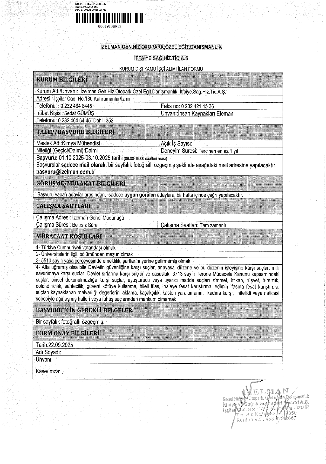 İzmir İzelman 1 İşçi Alacak. Son başvuru tarihi 3 Ekim 2025