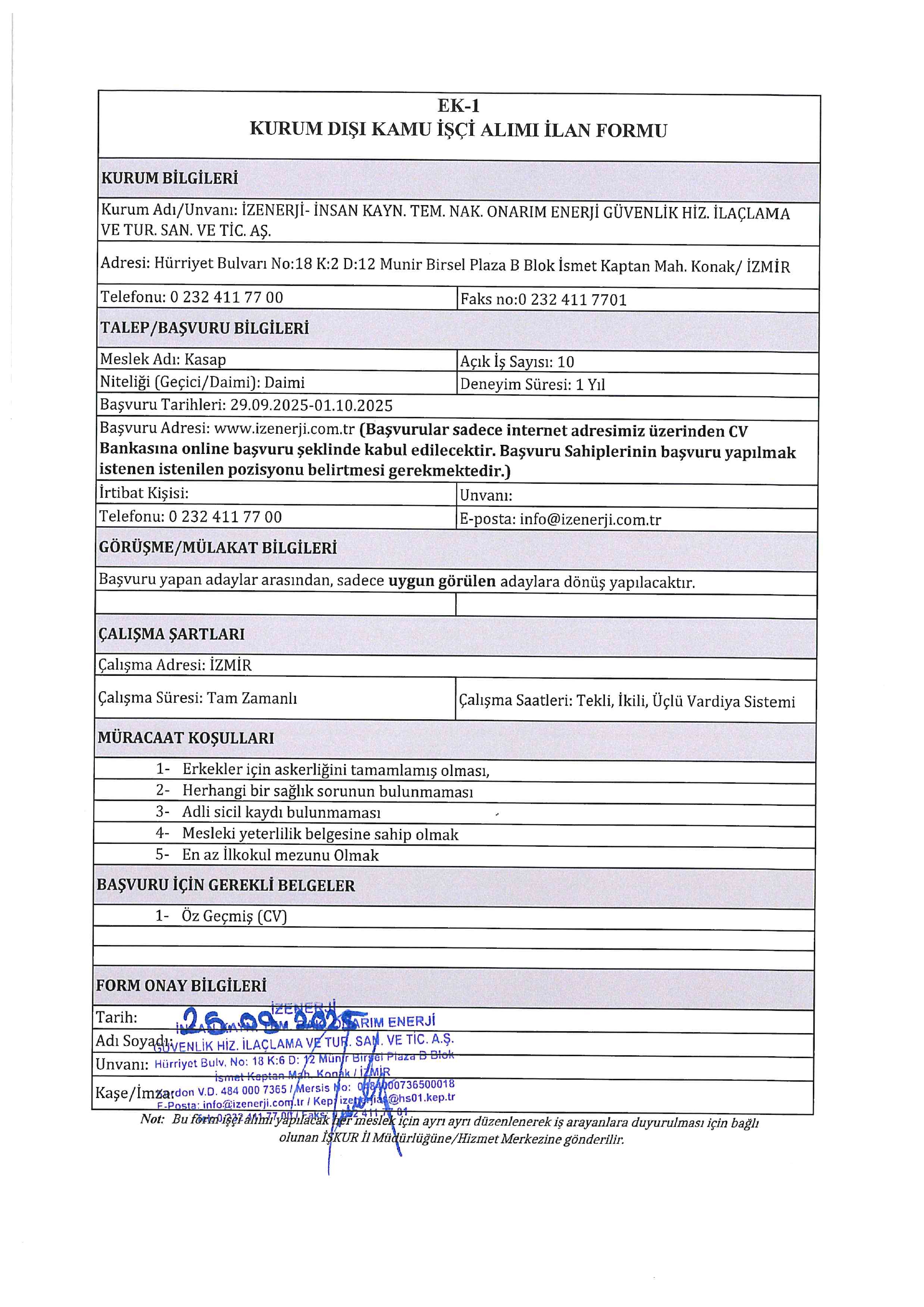 İzmir İzenerji Geçici 10 İşçi Alacak. Son başvuru tarihi 1 Ekim 2025