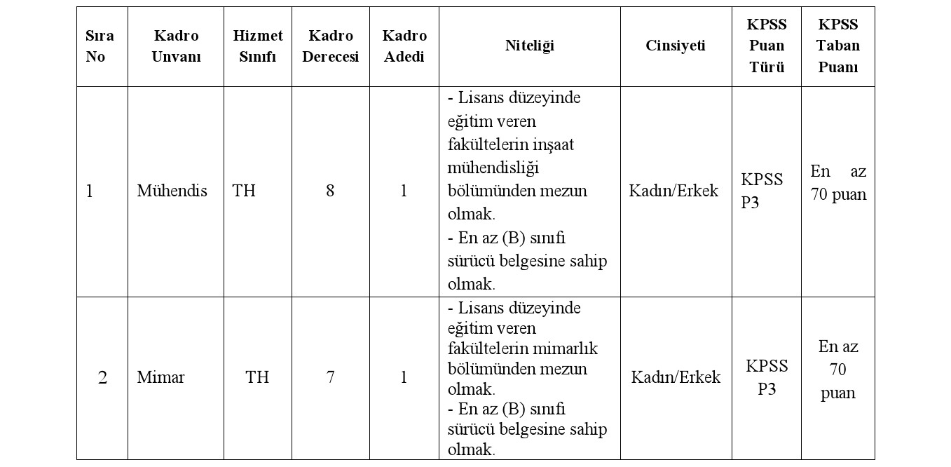 Bilecik ili Gölpazarı Belediye Başkanlığı bünyesinde, 657 sayılı Devlet Memurları Kanununa tabi olarak istihdam edilmek üzere; Mahalli İdarelere İlk Defa Atanacaklara Dair Sınav ve Atama Yönetmeliği hükümlerine göre aşağıda unvanı, sınıfı, derecesi, adedi, nitelikleri, KPSS puan türü, KPSS taban puanı ve diğer şartları taşımak kaydıyla belirtilen boş kadrolara açıktan atama yoluyla memur alınacaktır.