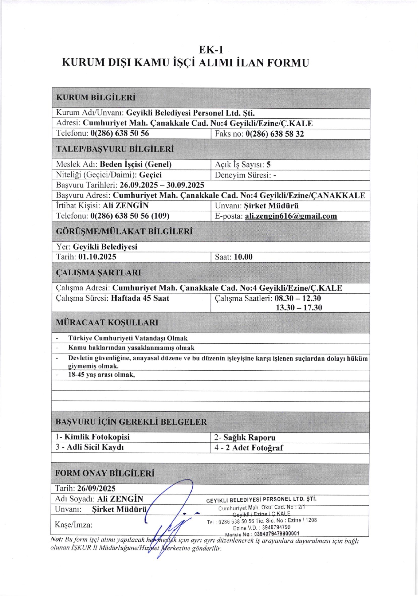 Çanakkale Geyikli Belediyesi Geçici 5 İşçi Alacak. Son başvuru tarihi 30 Eylül 2025