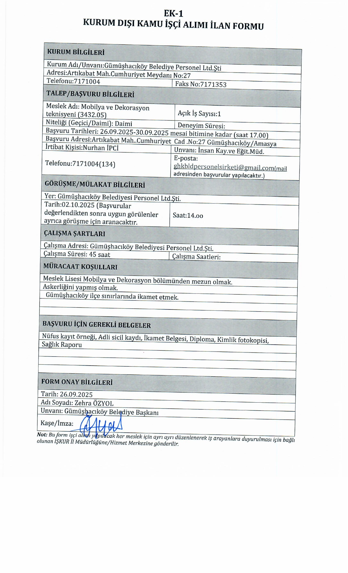 Amasya Gümüşhacıköyü Belediyesi 1 İşçi Alacak. Son başvuru tarihi 30 Eylül 2025