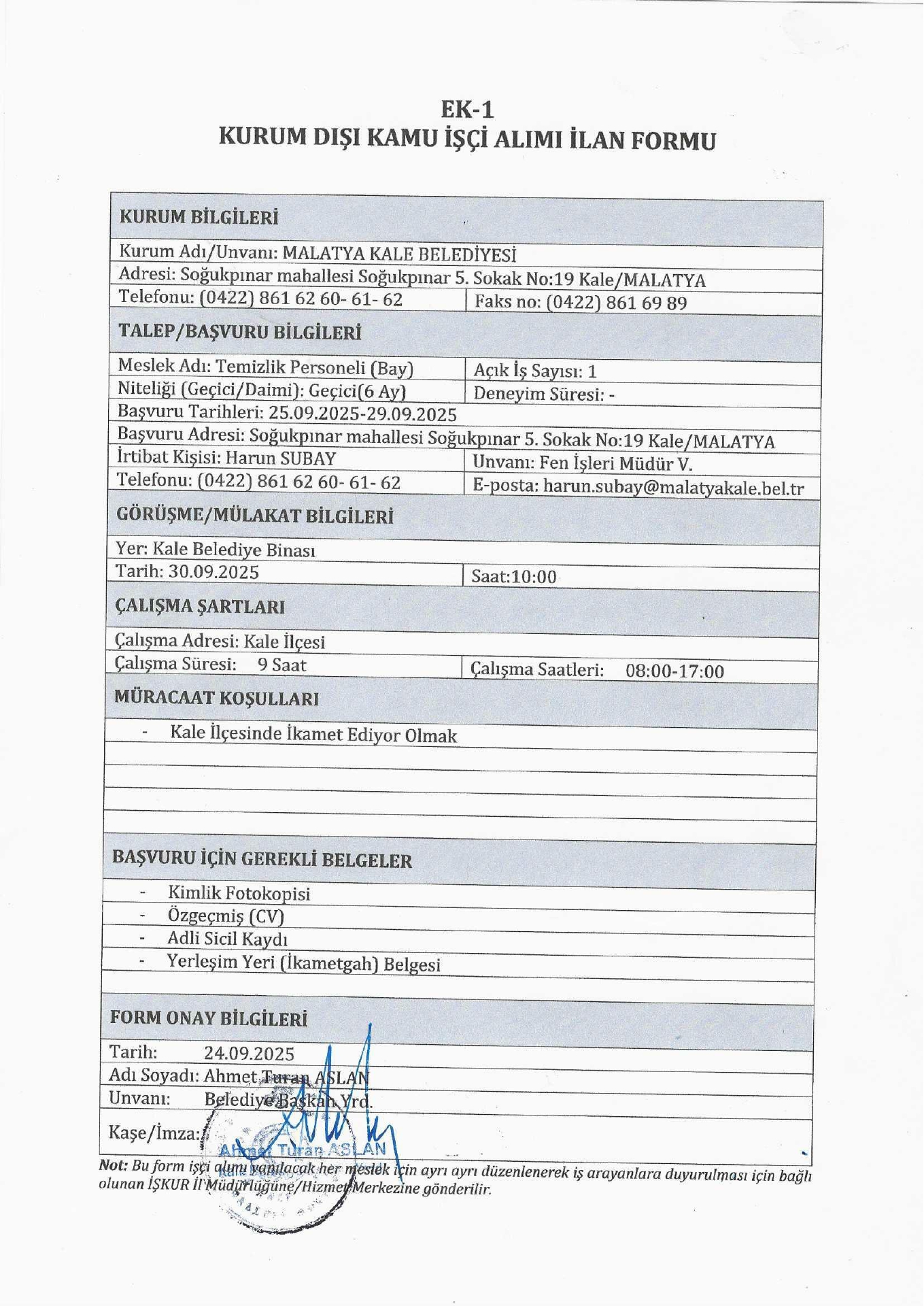 Malatya Kale Belediyesi Geçici 1 İşçi Alacak. Son başvuru tarihi 29 Eylül 2025