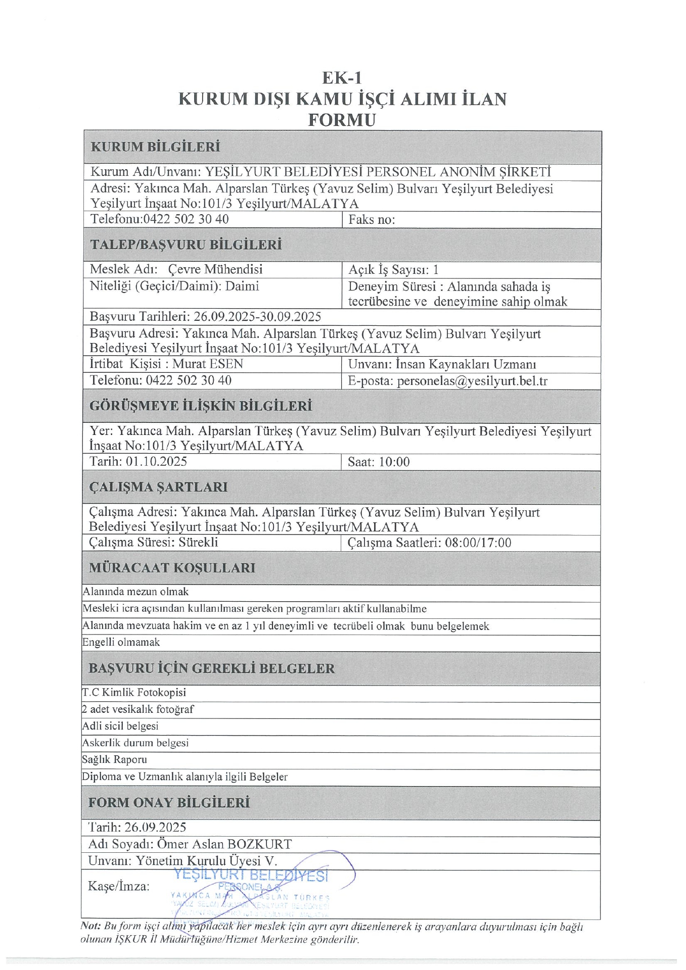 Malatya Yeşilyurt Belediyesi 1 İşçi Alacak. Son başvuru tarihi 30 Eylül 2025