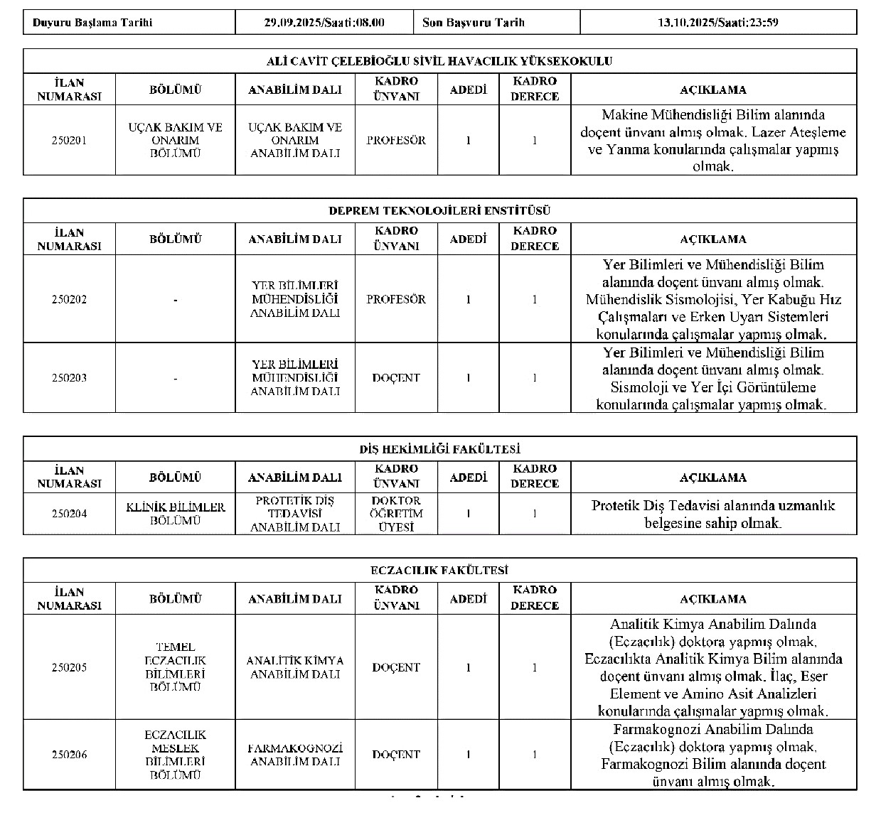3-2547 sayılı Kanunun ek 38. maddesi uy anne a belirlenen %30'luk kota kapsamında başvuru yapılabilecek doktor öğretim üyesi kadrosu bulunmamaktadır.