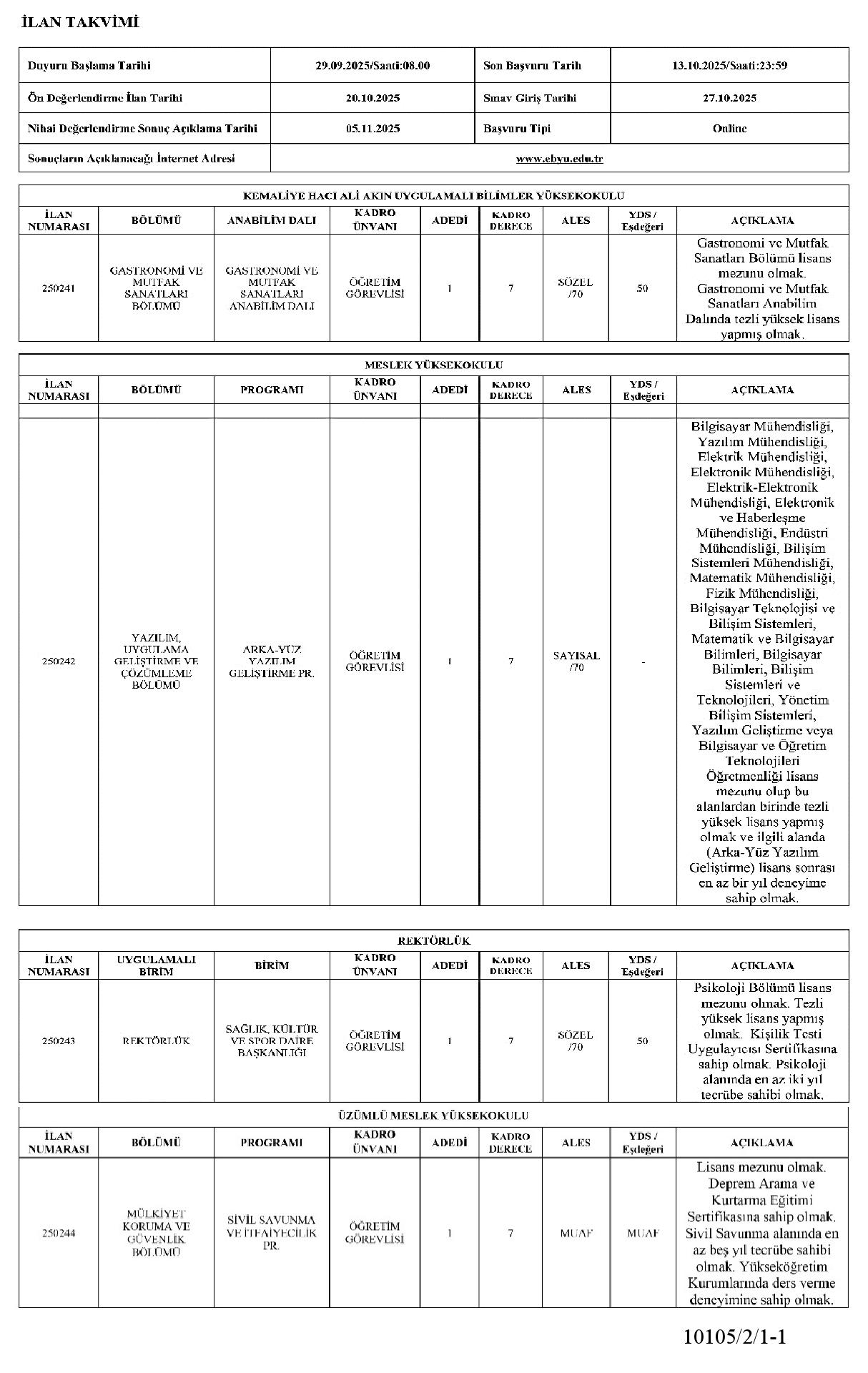 Uygulamalı Birim Öğretim Görevlisi kadrosu için Personel Daire Başkanlığından, Öğretim Görevlisi (Ders Verecek) kadroları için ilgili birimlerden bilgi edinilebilir.