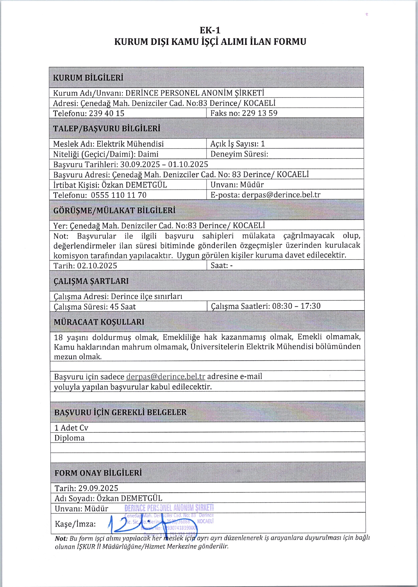 Kocaeli Derince Personel Anonim 1 İşçi Alacak. Son başvuru tarihi 1 Ekim 2025