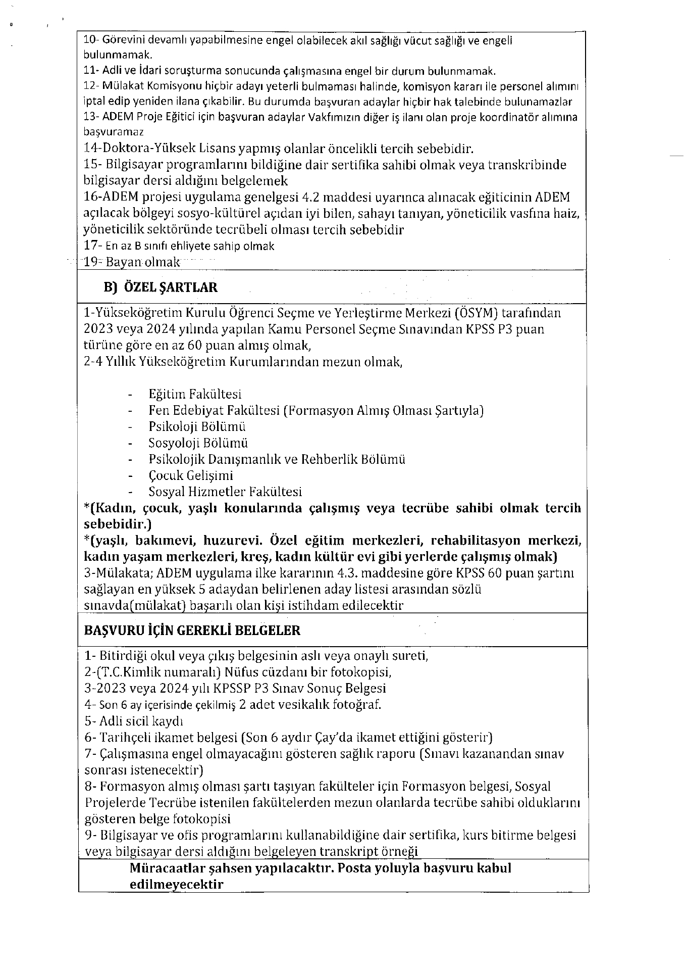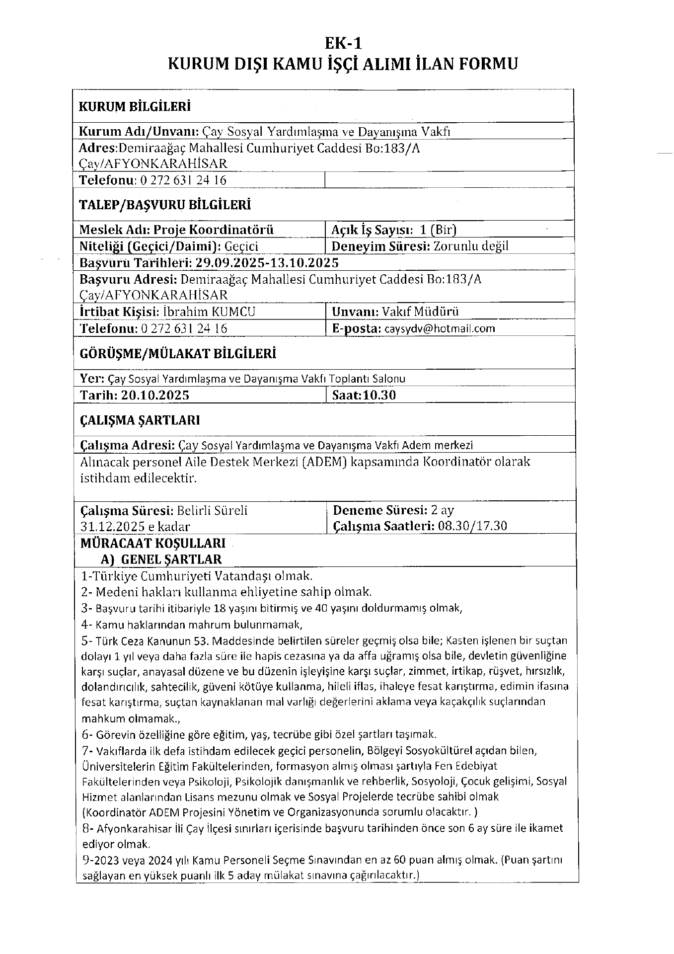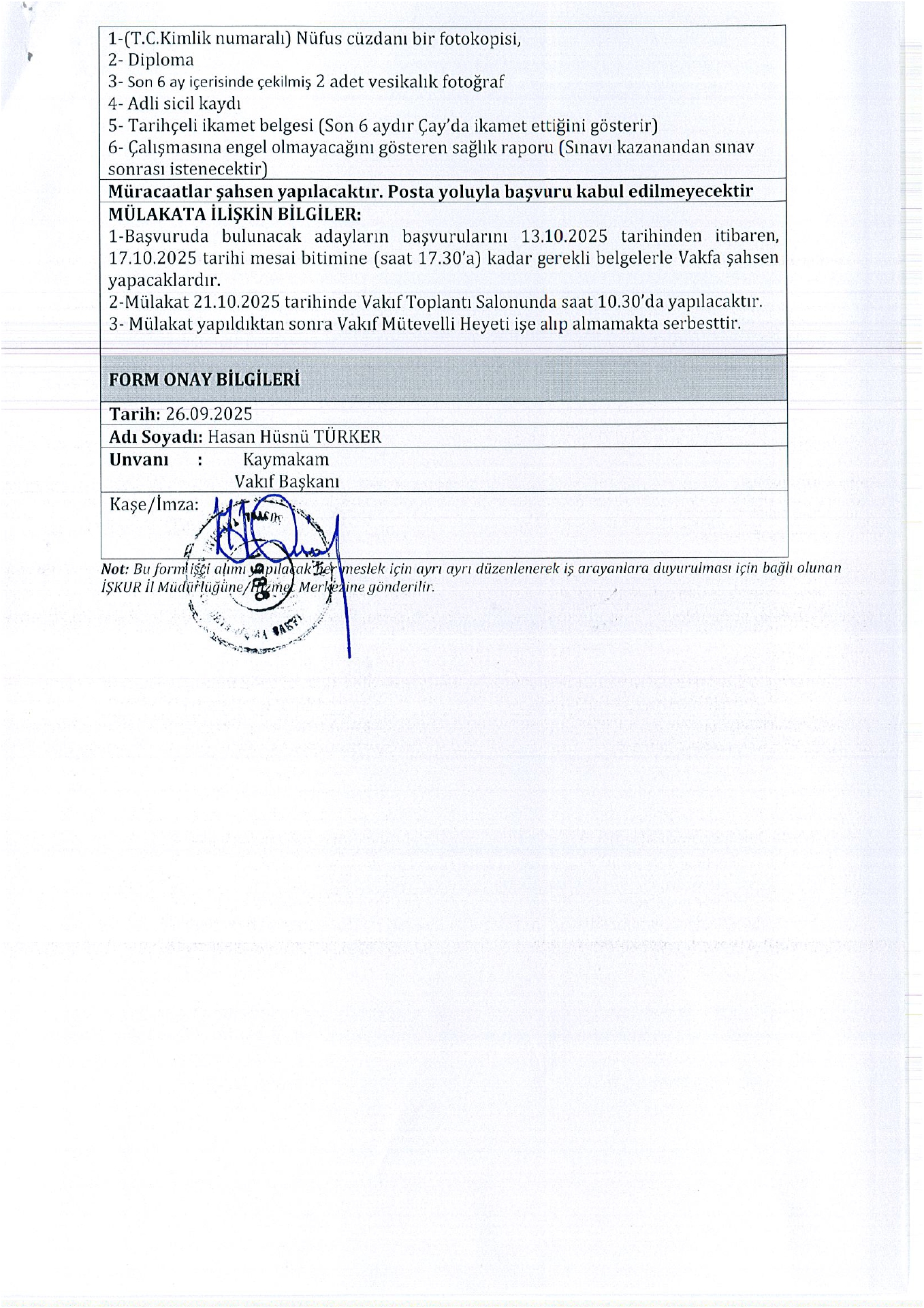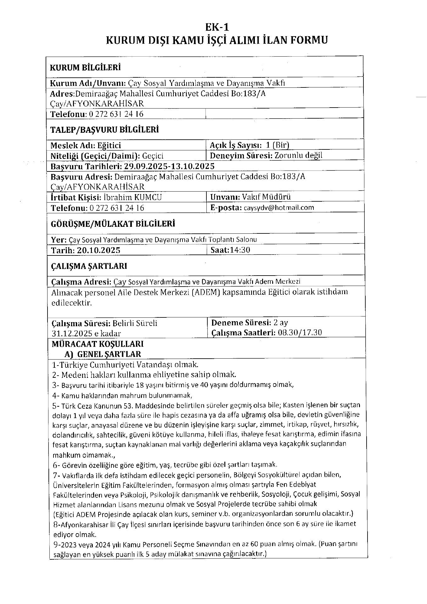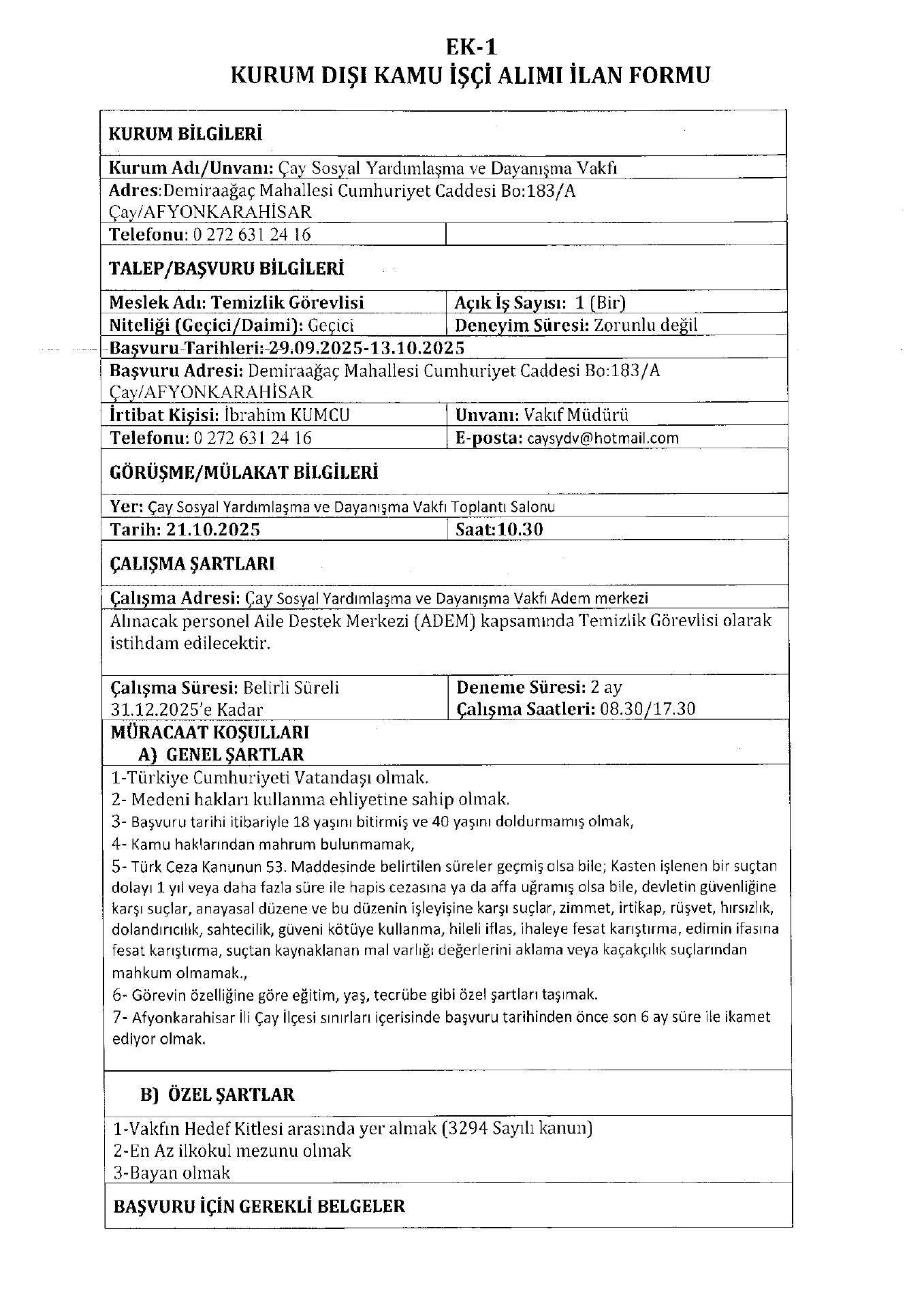 Afyonkarahisar Çay SYDV Geçici 3 İşçi Alacak. Son başvuru tarihi 13 Ekim 2025