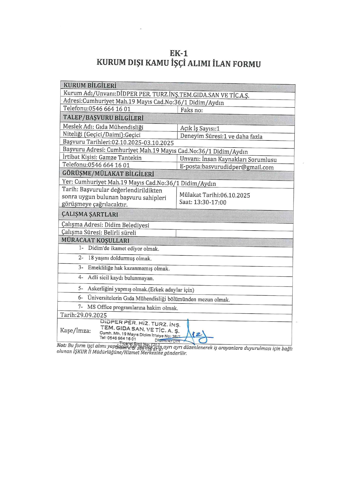 Aydın Didper Geçici 1 İşçi Alacak. Son başvuru tarihi 3 Ekim 2025