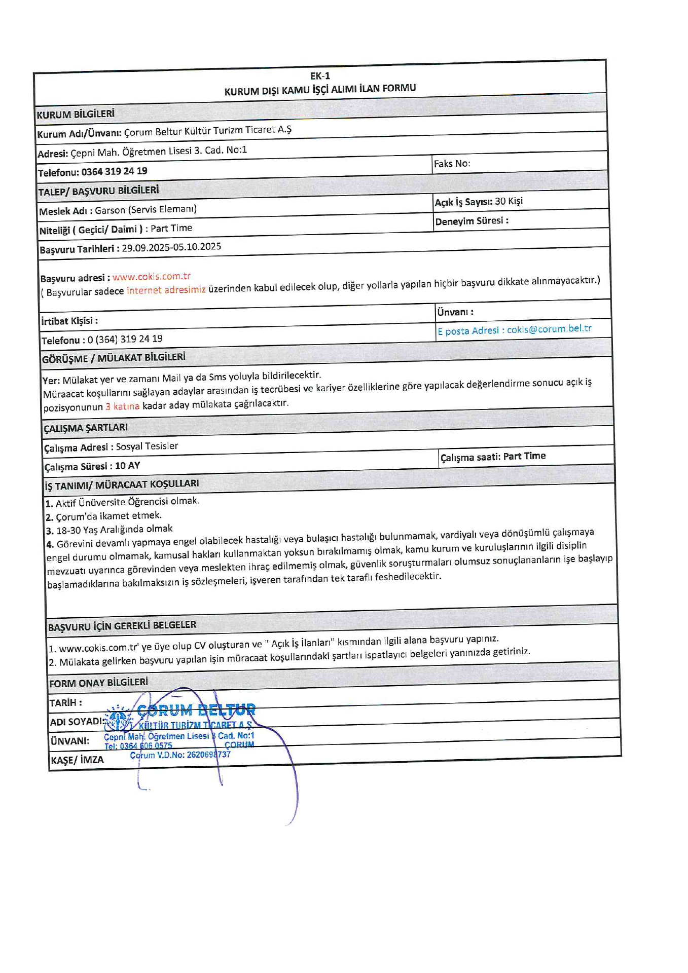 Çorum Betur Geçici 30 İşçi Alacak. Son başvuru tarihi 5 Ekim 2025