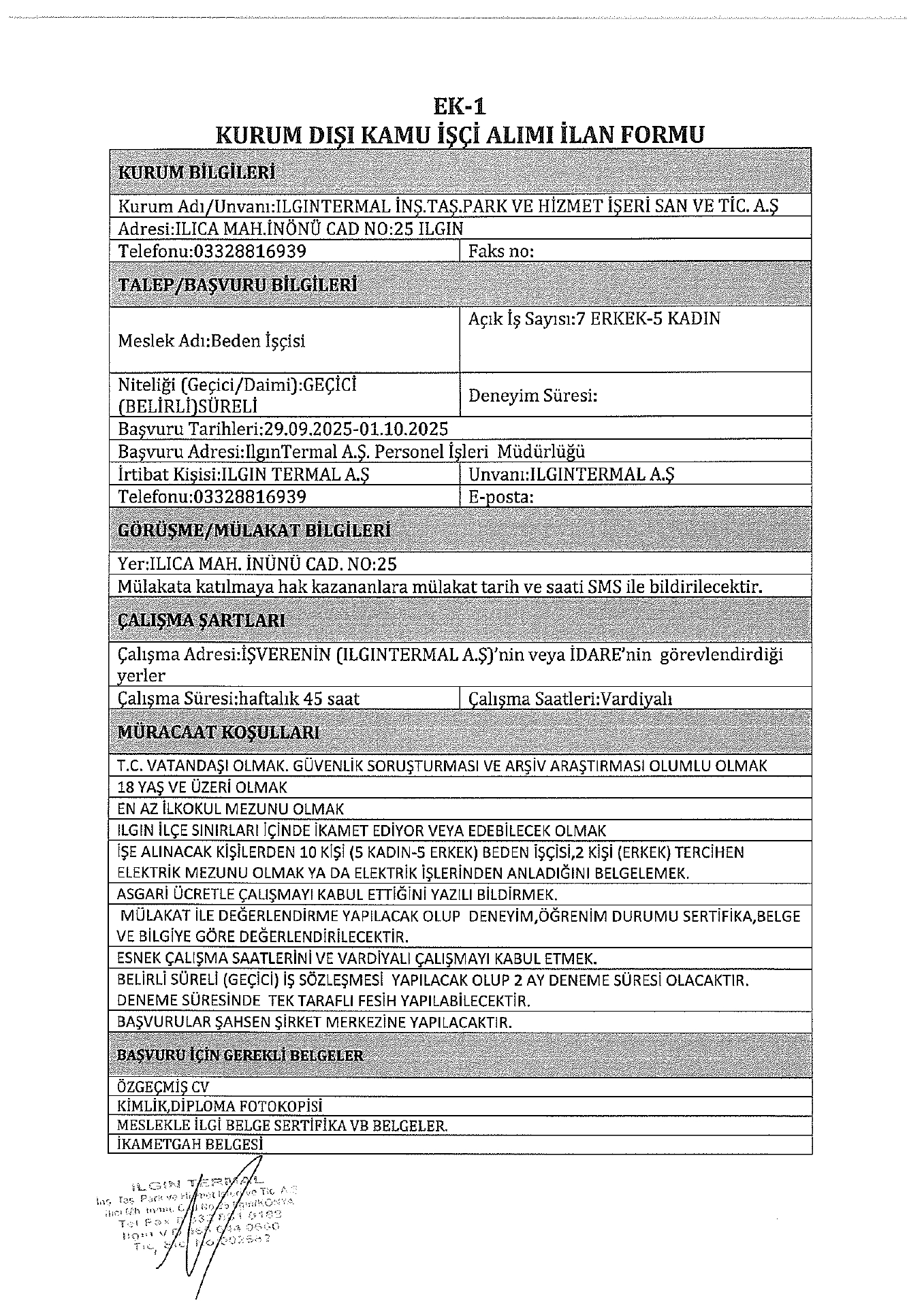 Ilgın Termal İnşaat Geçici 13 İşçi Alacak. Son başvuru tarihi 1 Ekim 2025