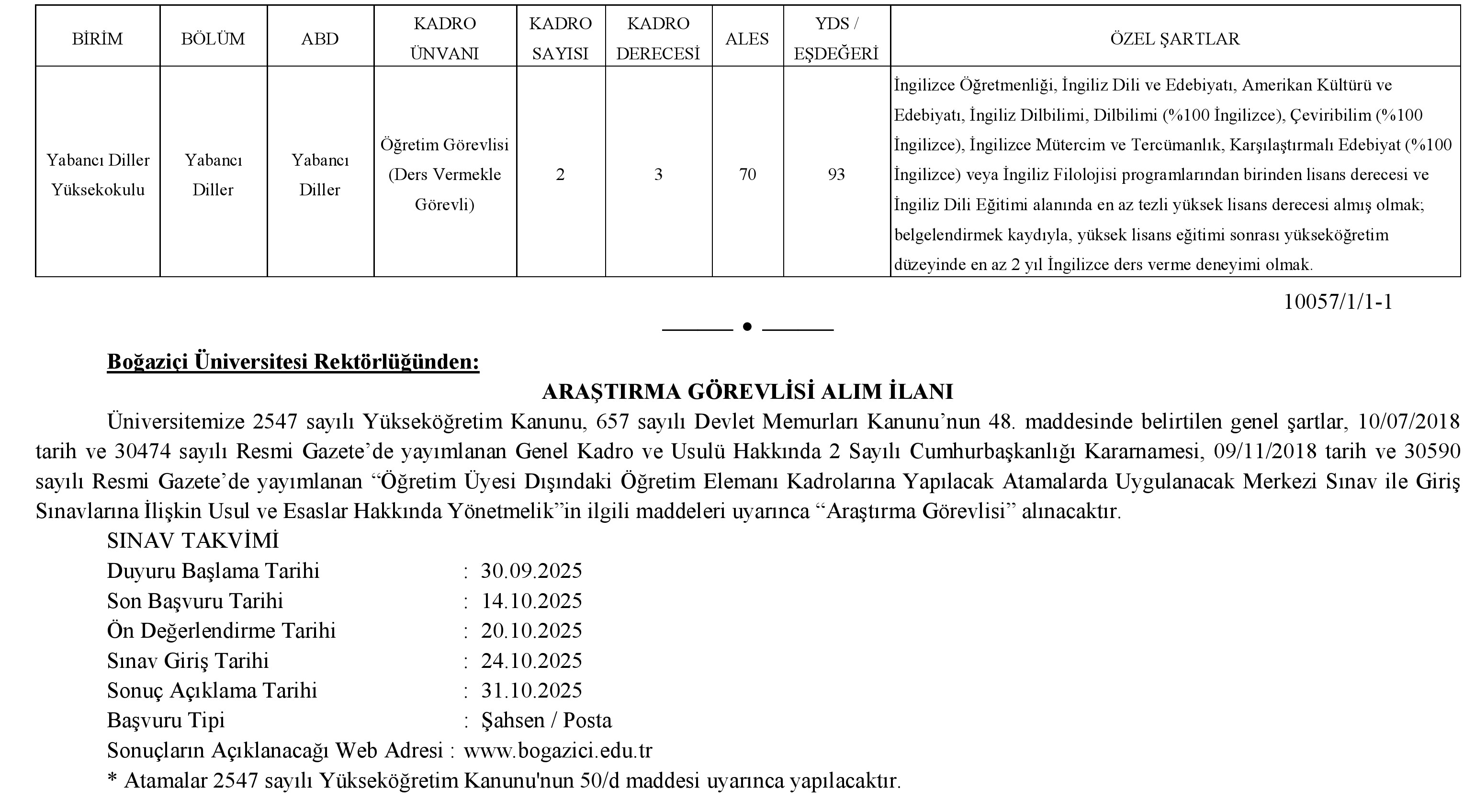Boğaziçi Üniversitesi Öğretim Üyesi ve Elemanı Alım İlanı. Son başvuru tarihi 14 Ekim 2025