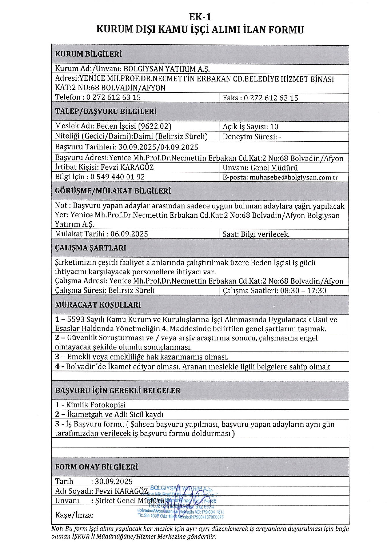 Afyonkarahisar Bolgiysan 10 İşçi Alacak. Son başvuru tarihi 4 Ekim 2025