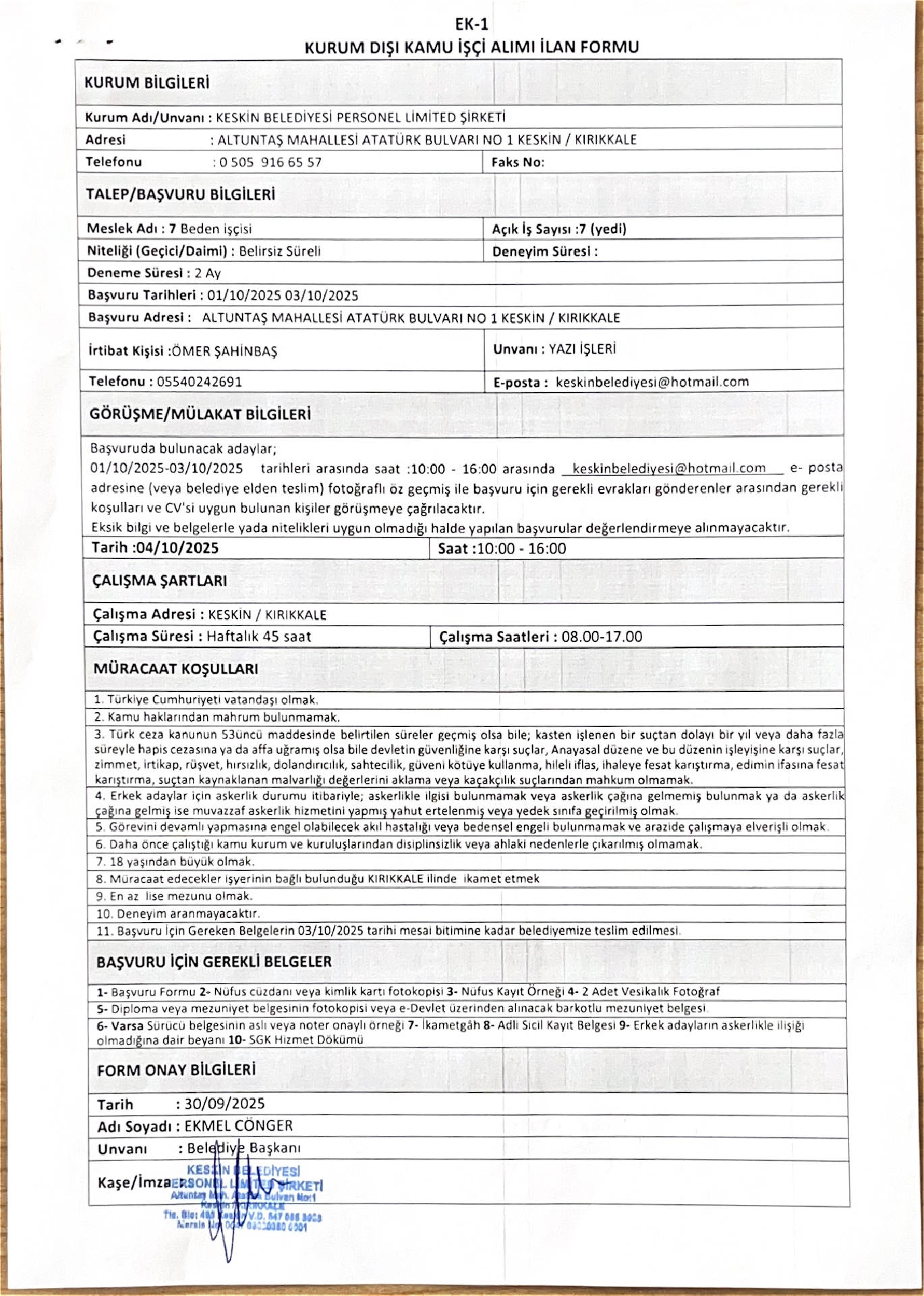 Kırıkkale Keskin Belediyesi 8 İşçi Alacak. Son başvuru tarihi 3 Ekim 2025