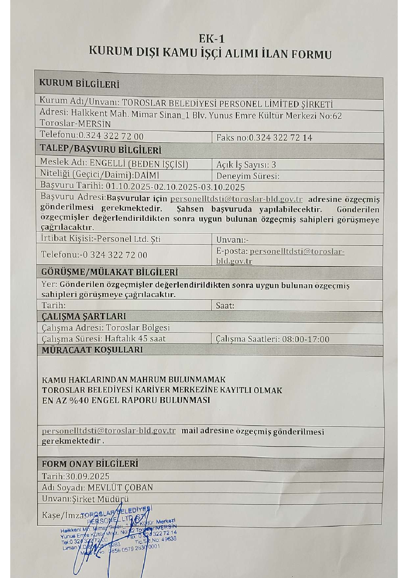 Mersin Toroslar Belediyesi 3 İşçi Alacak. Son başvuru tarihi 3 Ekim 2025